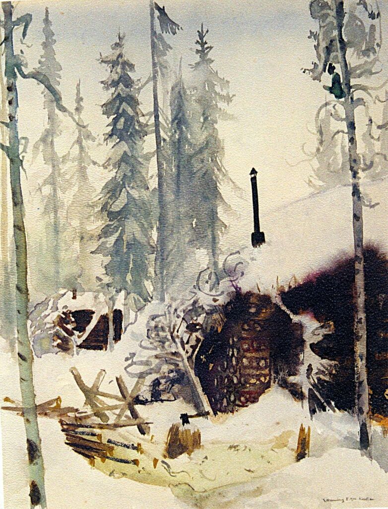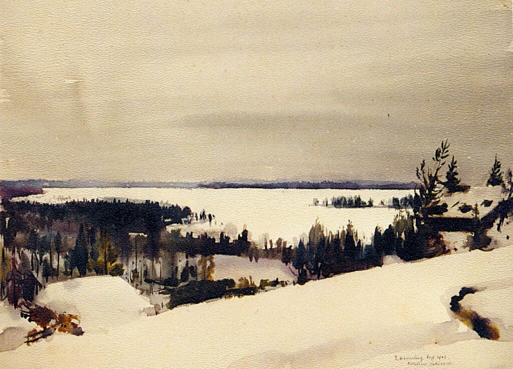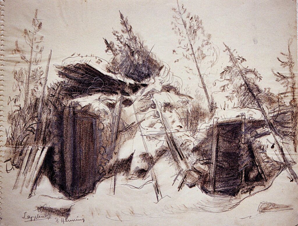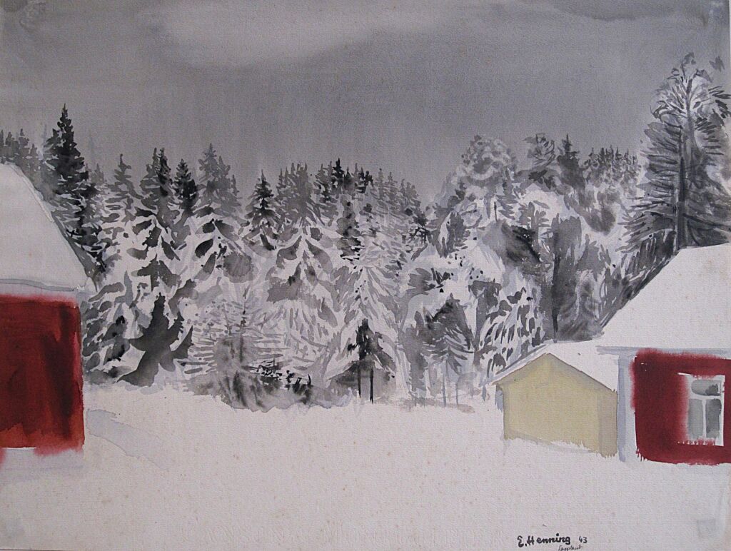 Im Oktober 1943 wird Erwin Henning nach Osten versetzt. In Finnland begleitet er die Truppen auf ihrem Lappland-Feldzug. Hier entstehen unter anderem wildromantische Winterlandschaften. Diese entsprechen durchaus den Vorgaben der PK. Solche Bilder sollten in der Heimat ablenken vom eigentlichen Kriegsgeschehen. Unter diesen Blättern findet sich auch eine reizvolle Ansicht von Rovaniemi, der Hauptstadt Lapplands, aus dem Jahr 1943. Ein Jahr später werden die deutschen Truppen auf ihrem Rückzug die ausschließlich aus Holzbauten bestehende Stadt dann in Schutt und Asche legen. Finnland wird im September 1944 von den Sowjets gezwungen, die Seite zu wechseln und die deutschen Truppen aus dem Land zu drängen.