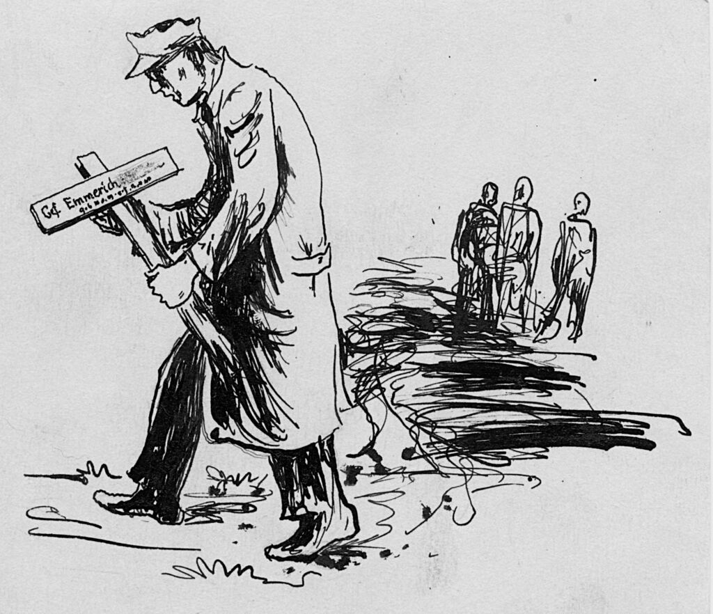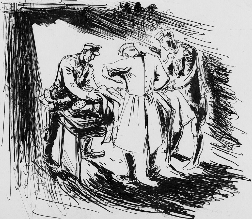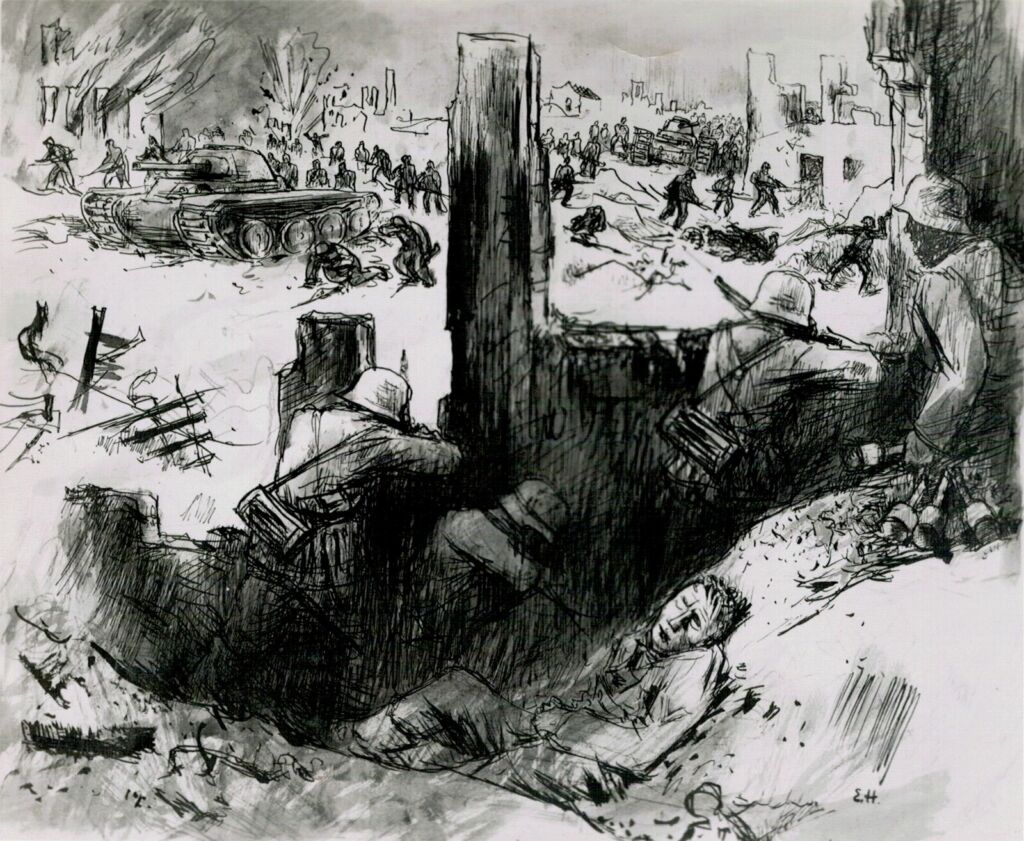 Aber natürlich haben die Künstler für die Propaganda auch andere Motive zu liefern als Stadtansichten und stimmungsvolle winterliche Szenen. Als Illustrationen für Berichte in Zeitungen und Zeitschriften entstehen auch Darstellungen von Kampfhandlungen. In Hennings Zeichnung „Gefechtsstellung“ zum Beispiel kämpfen Deutsche und Russen in einer Stadt. Im Hintergrund sind brennende Gebäude und Ruinen zu erkennen.