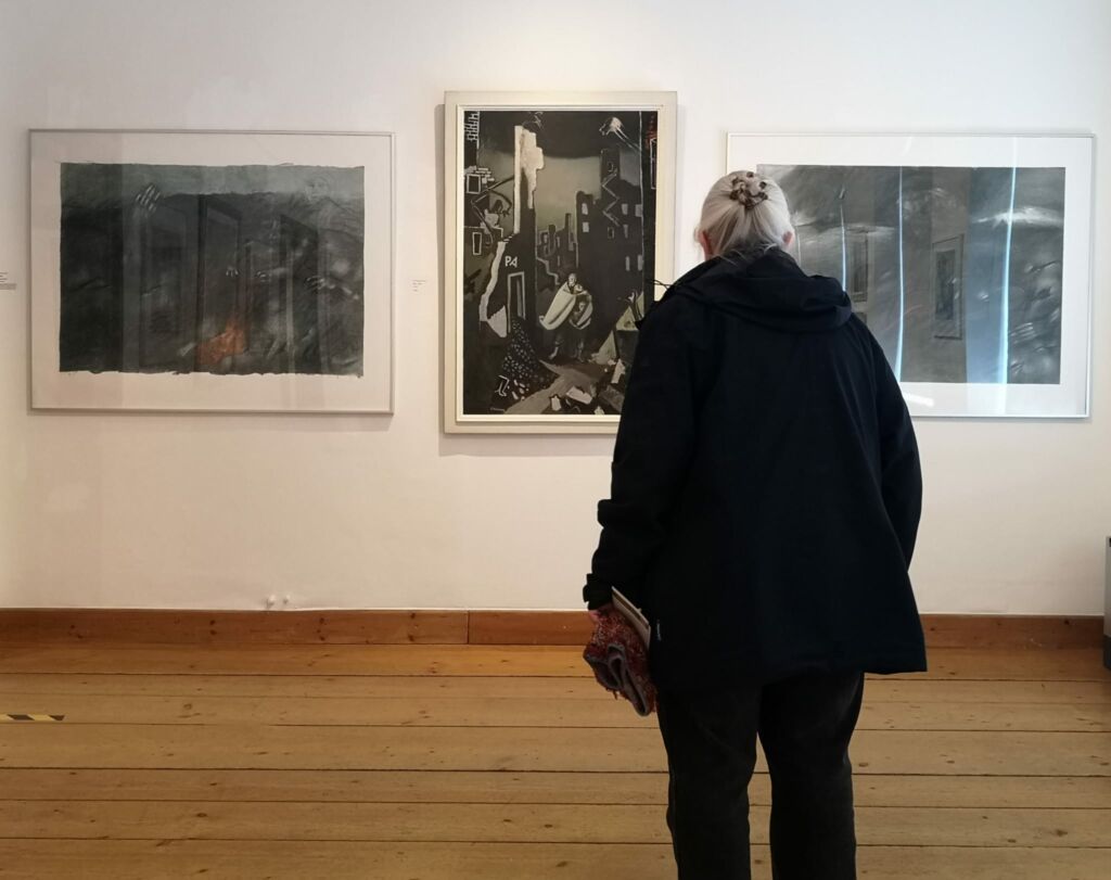 „Vision“, um 1947, hier 2023 in einer Ausstellung von Wolfgang Henning in Langenargen zwischen zwei von dessen Arbeiten, Foto: Herbert Eichhorn