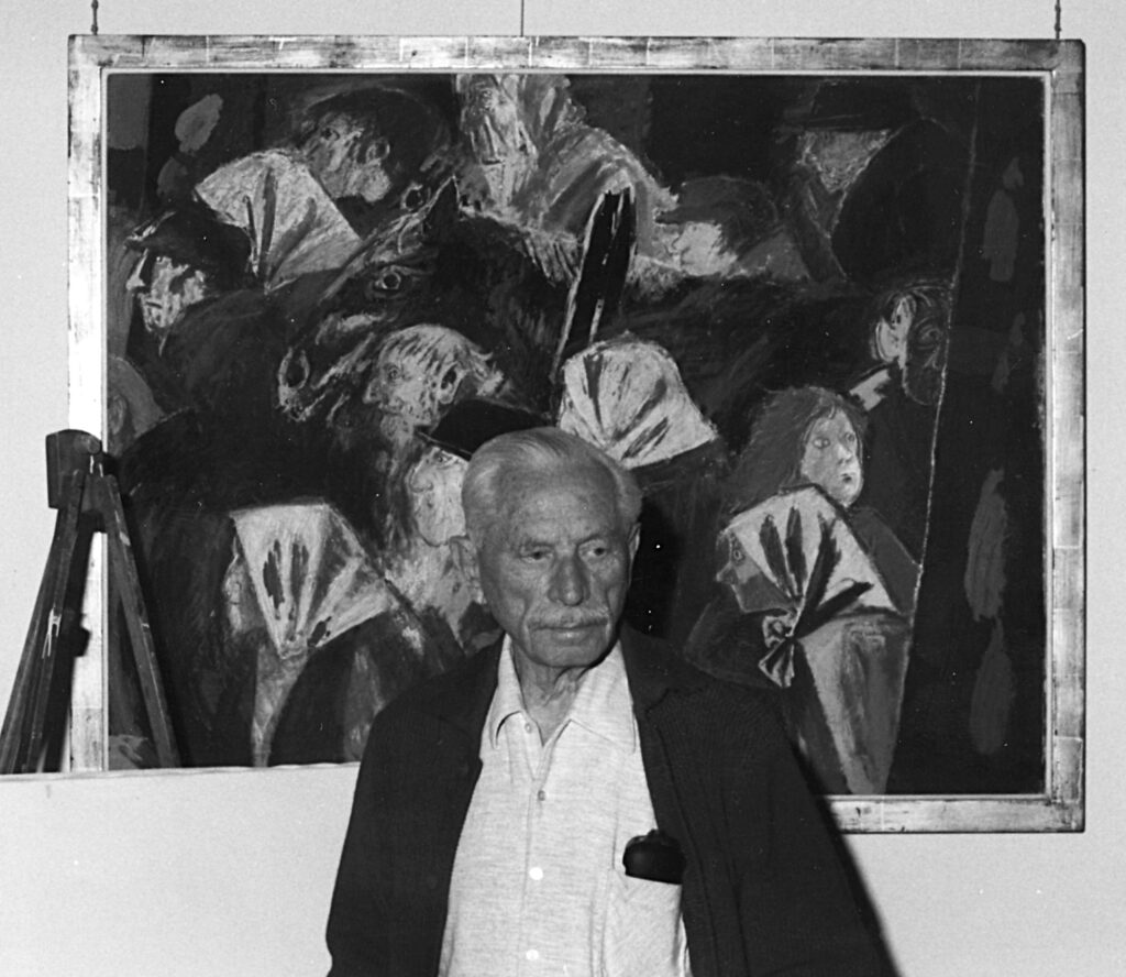 Erwin Henning vor seinem Gemälde „Auf der Flucht“, Foto: Hedy Baumgärtner, Archiv Henning – Karlsruhe.