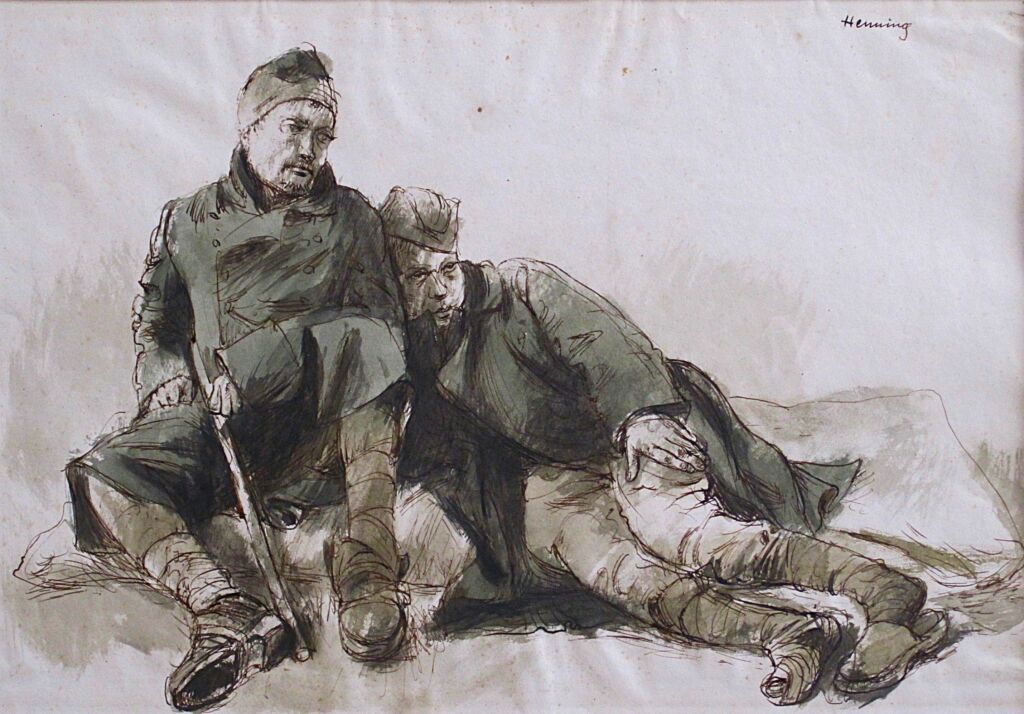 Jetzt gehen die über 100 Objekte aus Erwin Hennings Zeit als Kriegsmaler also nach Berlin: vor allem Aquarelle, Zeichnungen und dokumentierendes Fotomaterial, aber auch der umfangreiche Briefwechsel mit seiner Frau per Feldpost. Dort befinden sich, nebenbei bemerkt, bereits über 20 Arbeiten des Künstlers aus seiner Zeit bei der Propagandakompanie. Sie wurden nach dem Krieg in die USA gebracht und von dort später an Deutschland zurückgegeben. Alle diese Blätter legen Zeugnis ab von einem empfindsamen Künstler, der hoffte, sich durch den Dienst bei der Propagandakompanie wenigstens von den schlimmsten Seiten des Krieges fernhalten zu können. Was er aber in den Kriegswintern 1943/44 und 1944/45 dort im Osten sah und erlebte, hat ihn trotzdem traumatisiert und tiefe Spuren in Leben und Werk hinterlassen.