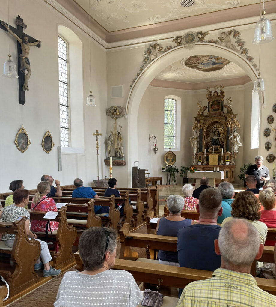 Der kurze Weg in die Pfarrkirche St. Stephanus, vorbei am Grab von Hans Schäffeler, und die Einstimmung mit einem Loblied war die Überleitung zu einer Kirchenführung von Günter Brutscher aus Mennisweiler. Der pensionierte Schulleiter hat Beschreibungen und Fotos von unzähligen Wegzeichen, Kirchen, Kapellen, Flurkreuzen und Lourdesgrotten in Oberschwaben und im Allgäu zusammengetragen und ins Internet gestellt. Dafür erhielt er im Jahr 2021 einen Preis der Stiftung Wegzeichen-Lebenszeichen-Glaubenszeichen der Diözese Rottenburg-Stuttgart. 15 bis 20 Stunden pro Woche arbeitet Günter Brutscher nach eigenen Angaben im Durchschnitt an seinem Projekt. Viele Orte sucht er mit Fahrrad und Kamera auf. Die Kirchen- und Kapellenführer erstellt der Pädagoge digital als Mindmap (Diagramme mit Hinweispfeilen). Ausgedruckt und foliert lassen sich diese vor Ort auslegen. Einen Herlazhofer Kirchenführer hatte Brutscher natürlich auch im Gepäck und war bestens vorbereitet, die Heiligenfiguren, Deckengemälde und Künstler genau zu erklären. Zum Abschluss stimmte Monika Heinz „Großer Gott, wir loben dich“ an, bevor es hinausging, bei herrlichem Sommerwetter, Richtung Moorbad zum Therapiezentrum Sonnenhof.
