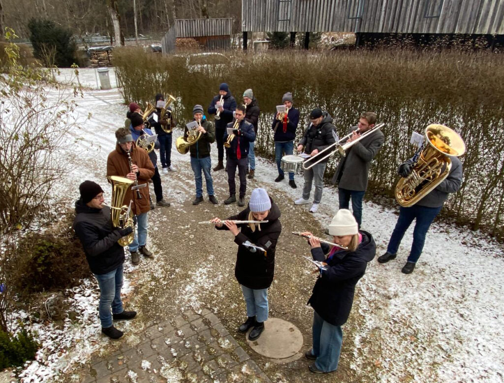 Hofs / Rotis – Wie es vielerorts der Brauch ist, so auch im Bereich der Pfarrgemeinde Hofs: Die örtliche Musikkapelle zieht von Haus zu Haus, von Weiler zu Weiler, um weihnachtliche Musikgrüße zu entbieten. Am 27. Dezember in der Frühe starteten die Musikanten in Rotis. Unser dort ansässiger Reporter Julian Aicher und seine Frau freuten sich sehr über das Ständchen. Und Julian griff sofort zur Kamera und sandte der Redaktionsleitung zwei Fotos und folgende Zeilen: