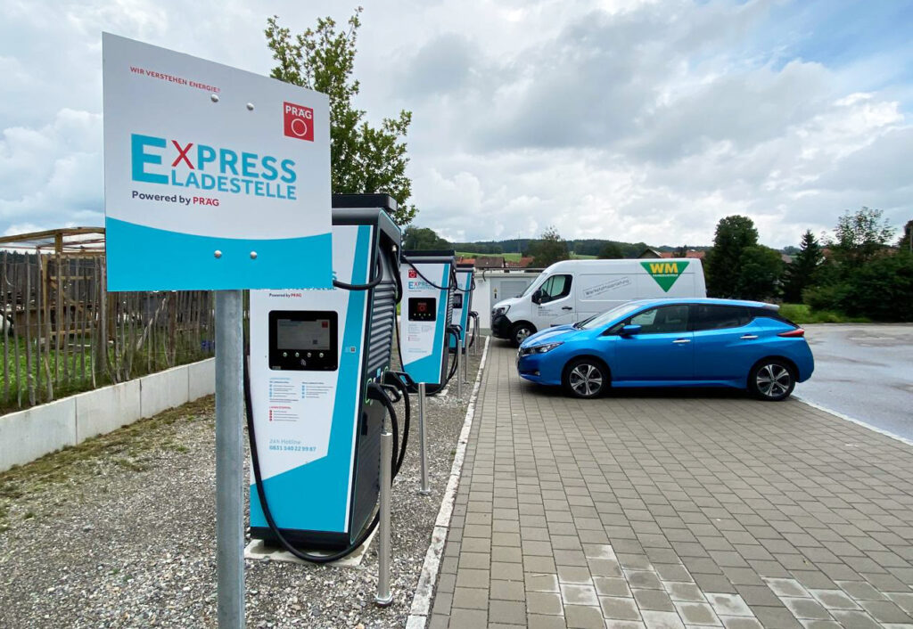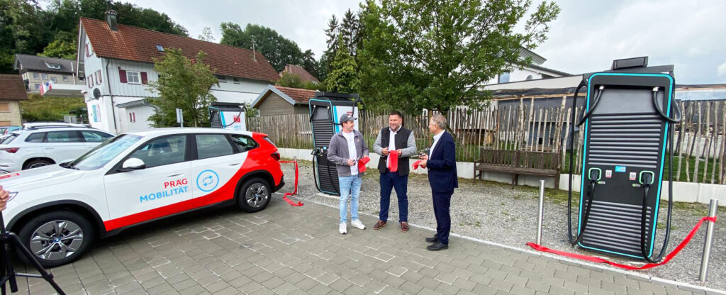 Diepoldshofen – Donnerstag, 31. Juli, um 10.30 Uhr in Diepoldshofen auf dem Parkplatz der Bäckerei Steinhauser: Einweihung von drei Schnell-Ladesäulen für Elektrofahrzeuge auf der Auto-Stellfläche direkt hinter dem Steinhauser-Café. Mit je 300 Kilowatt Leistung. Die Kemptener Energiefirma Präg hat die Anlage errichtet.