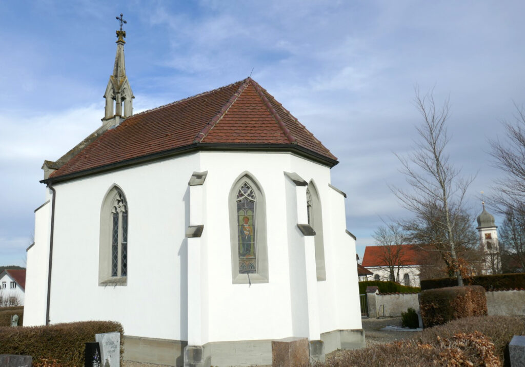 Stuttgart / Wuchzenhofen – Seit 1867 steht in Wuchzenhofen eine Friedhofskapelle auf dem Gottesacker am Ende des Baurenbergwegs. Mit ihren Spitzbogen, der Portaleinrahmung und dem filigranen Glockentürmchen ist sie eine typische Vertreterin der neugotischen Architektur in Oberschwaben aus der zweiten Hälfte des 19. Jahrhunderts.