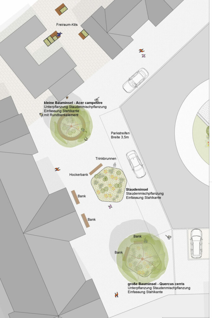 Bänke, Trinkbrunnen, kleine Bauminsel (oben), Staudeninsel (Mitte), große Bauminsel (unten) – das sieht der Pflanzplan vor. Im Plan ist der Bahnhof links zu sehen. Plan: Stadt