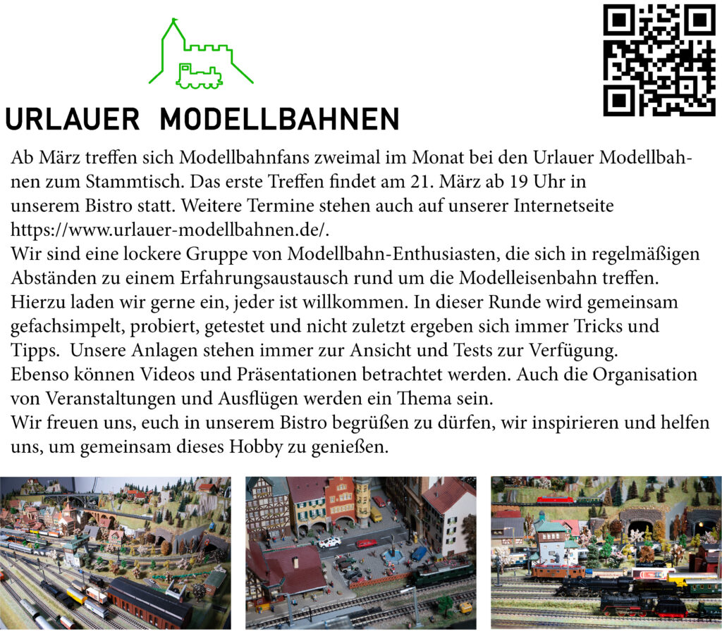 Urlau – Ab März treffen sich Modellbahnfans zweimal im Monat bei den Urlauer Modellbahnen. Das erste Treffen findet am 21. März ab 19.00 Uhr in unserem Bistro statt.