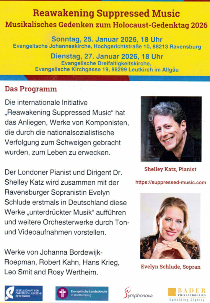 Der Londoner Pianist und Dirigent Dr. Shelley Katz wird zusammen mit der Ravensburger Sopranistin Evelyn Schlude erstmals in Deutschland diese „unterdrückte Musik“ aufführen. Das erste Konzert findet am Sonntag, 25. Januar, 18.00 Uhr in der Ev. Johanneskirche Ravensburg (Hochgerichtsstraße 10) statt. Das zweite Konzert am Dienstag, 27. Januar, 18.00  Uhr in der Ev. Dreifaltigkeitskirche in Leutkirch (Evangelische Kirchgasse 19). In beiden Konzerten wird Dr. Shelley Katz auch über den Hintergrund der aufgeführten Werke informieren. Der Eintritt ist frei.