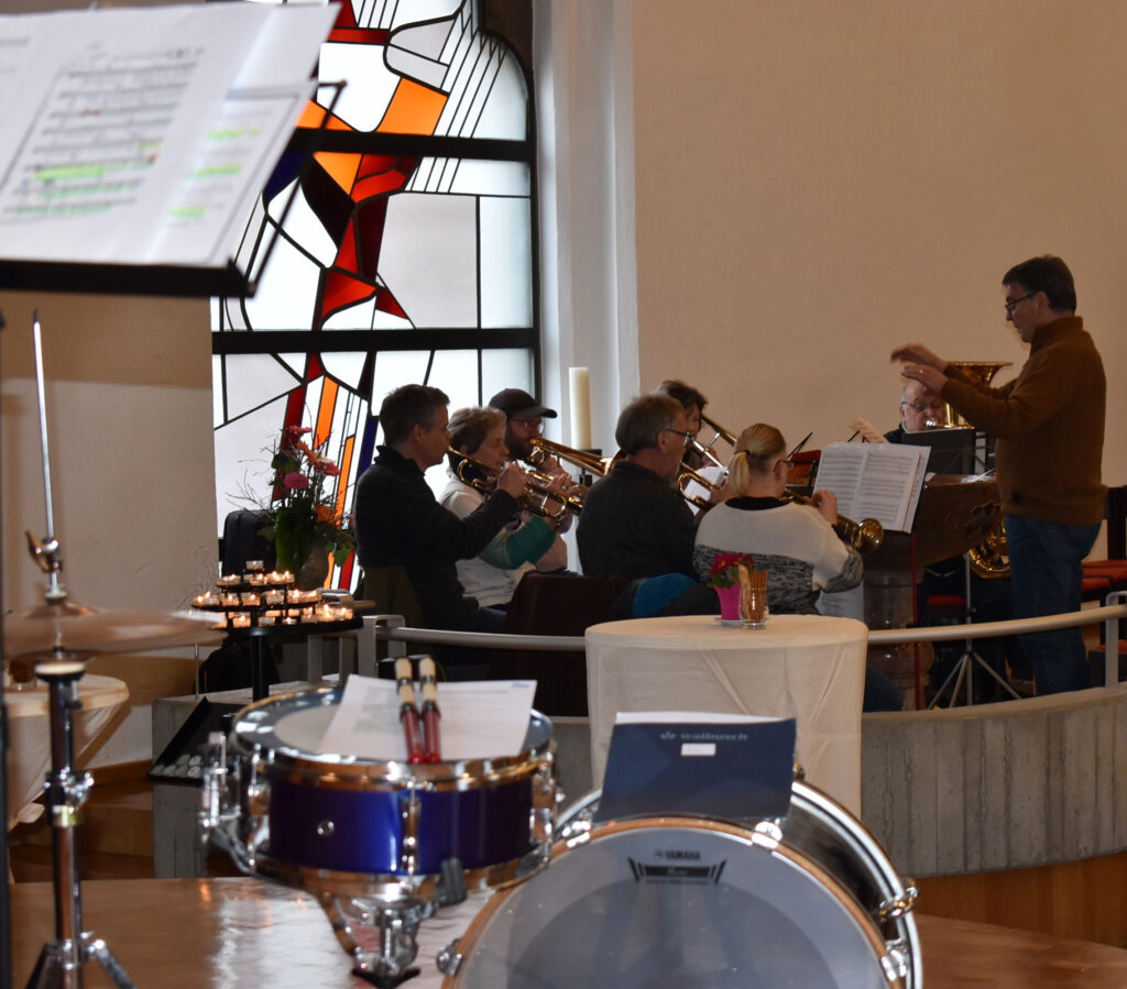 Die Kirchengemeinderäte bekamen alle einen Anstecker und Gratulationen von allen Seelsorgern, die Blechbläser (Bild) intonierten Kirchenlieder. Die Gemeinde sang mit dem Musik-Team und mit dem Neuen Chor und am Schluss gab es viel Beifall für alle Mitwirkende.