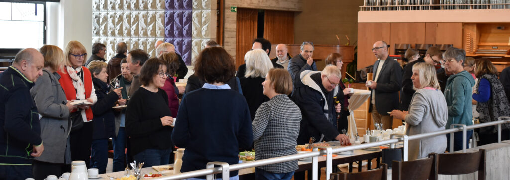 Nach dem Segen wurden die Anwesenden zum Kirchen-Café eingeladen. Fleißige Hände hatten Häppchen und Kuchenstücke vorbereitet, es gab Kaffee, Tee und Säfte. Die meisten blieben und kamen schnell ins Gespräch, hatten Freude an der Gemeinschaft. Im Foyer konnte man auf Zetteln eine Bitte oder Info an die neuen Kirchengemeinderäte notieren , was einige Bürger nutzten.