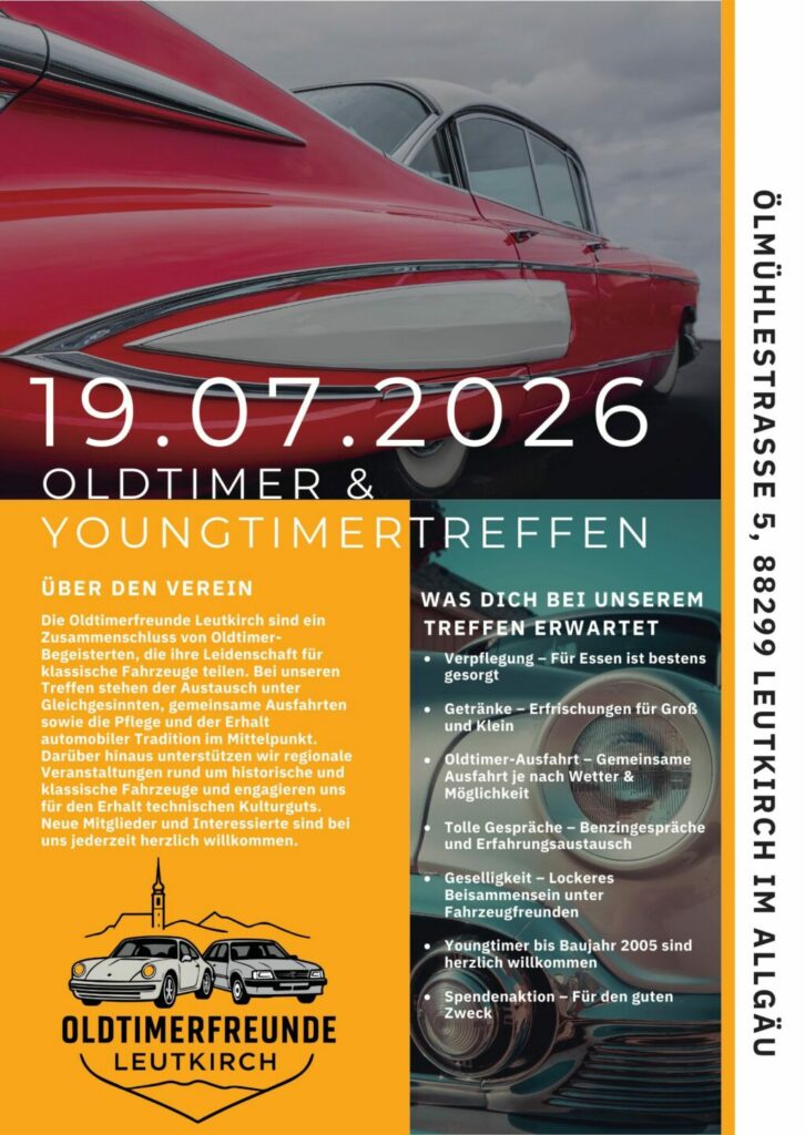 Leutkirch – Großes Youngtimer- und Oldtimertreffen am 19. Juli in Leutkirch in der Ölmühlestraße 5. Beginn ist um 10.00 Uhr.
