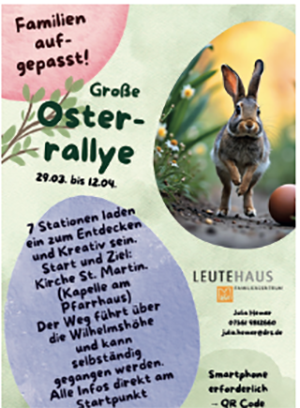 Nochmals herzliche Einladung an alle Familien: In den Osterferien gibt es vom Familienzentrum eine Osterrallye. Start ist an der Marienkapelle zwischen Kirche und Pfarrhaus. 7 Stationen über die Wilhelmshöhe laden ein, spielerisch die Natur zu entdecken und dem Osterhasen ein Stück näher zu kommen. Infos gibt es direkt am Startpunkt. Am Ende wartet auf jedes Kind eine Überraschung. Weitere Informationen bei Julia Hemer: julia.hemer@drs.de oder telefonisch unter der Nummer 9812660.