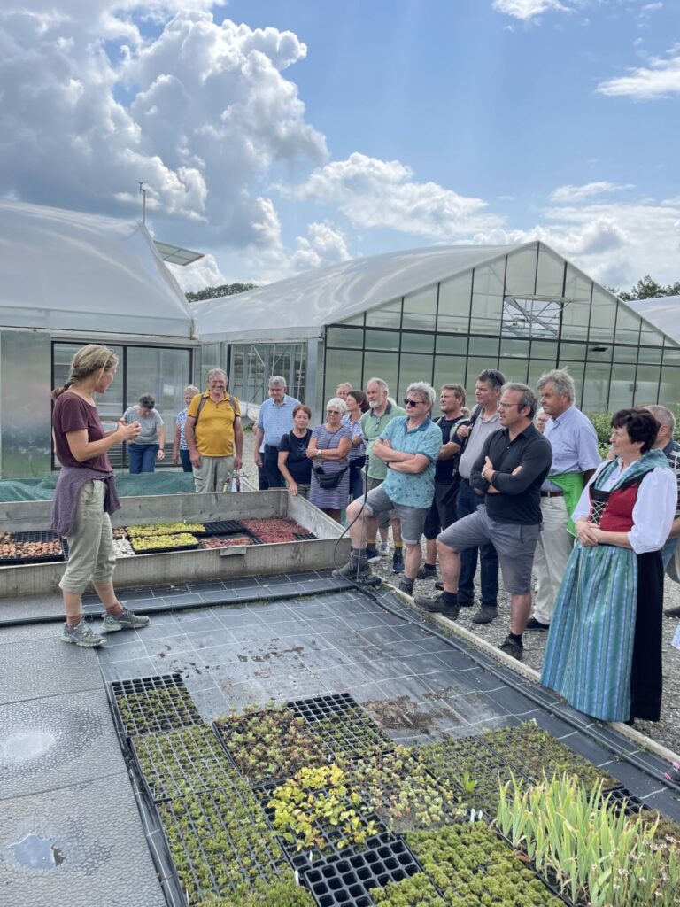 Ulrike Bosch, Mitinhaberin von Allgäu-Stauden, führte nun durch die Gartenanlage, sie informierte über die Entstehung der Gärtnerei und erklärte an Beispielen die Vermehrung und Aufzucht verschiedener Stauden, Kräuter, Gräser, Farne und Rosen. Am Standort in Weipoldshofen wird nach Bioland-Richtlinien produziert, von der Aussaat oder anderen Vermehrungsarten, über die Aufzucht, bis zum fertigen Produkt. Das Sortiment umfasst neben Stauden auch Kräuter, Gräser, Farne und Rosen, derzeit ca. 1.400 verschiedene Arten und Sorten. Die Vermarktung erfolgt inzwischen zum Großteil online an Endkunden. Wertvolle Tipps und fachliches Wissen gibt die rührige Unternehmerin gerne persönlich weiter, auch zur Veröffentlichung in Fachzeitschriften und über die Internetseite.