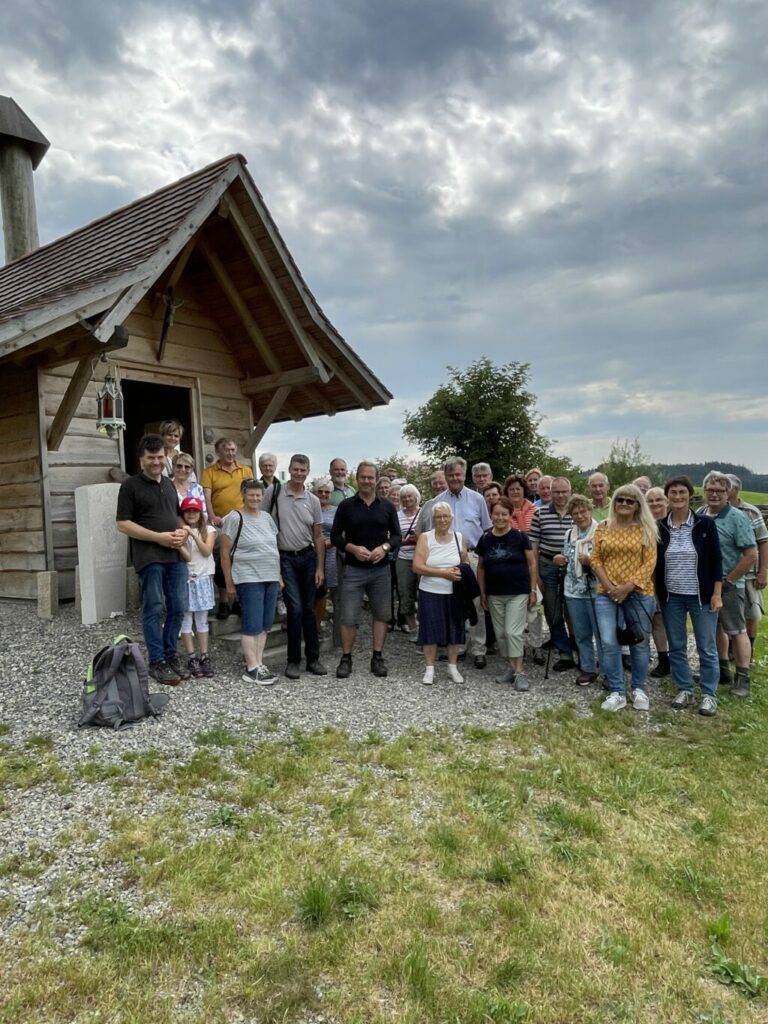 Nach diesem geistlichen Impuls ging es zu Fuß weiter Richtung Klausenwald. Dort auf der Anhöhe steht seit ein paar Jahren eine Holzkapelle, gebaut auf private Initiative. Die Kapelle steht für die Dankbarkeit, dass es den beteiligten Familien gut geht und dass sie gesund sind. Renate Miller und Ursula Sonntag erklärten, wie es dazu kam. Die Idee entstand bei einem gemeinsamen Urlaub, als man beim Wandern eine Kapelle entdeckte, die zwischen zwei Bäumen gebaut wurde. Der Gedanke, so etwas Ähnliches zu bauen, ließ die Familien nicht in Ruhe, bis der Vorschlag aufkam, der Platz auf der Anhöhe zwischen den zwei Käfertannen wäre doch ideal. So holte man einen Freund dazu. Es wurden Entwürfe gezeichnet, bis schließlich der Plan zur Umsetzung fertig war. Nach und nach machten sich die befreundeten Familien an die Umsetzung.
