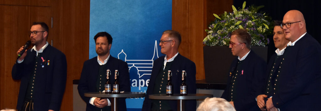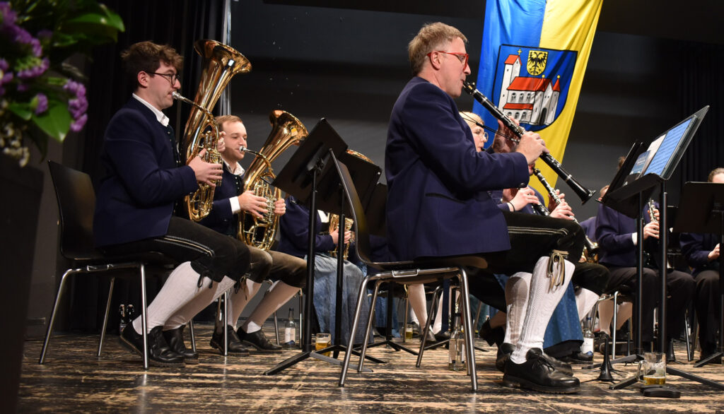 Am blauen Banner mit einem nagelneuen Logo der Stadtkapelle (Bild) fanden sich fünf Musiker ein. Unter der Moderation von Stephan Wandinger hielten vier ehemalige Vorsitzende ein Resümee über die letzten 30 Jahre der Stadtkapelle, was sich verändert, verbessert und alles getan hat. Sie erzählten von Festen, Konzerten, Ausflügen, Wertungsspielen und dem Zusammenhalt, auch trotz der Corona-Zeit. Es berichteten Christoph Kuon, Roland Mehr, Wolfgang Nägele und Luis Hutter, der bis 2025 den Vorsitz hatte. Der neue Vorstand Frank Weitgasser ist noch nicht lange Mitglied der Stadtkapelle, war aber früher einmal 11 Jahre mit dabei. Seine Heimatkapelle ist Schloß Zeil.