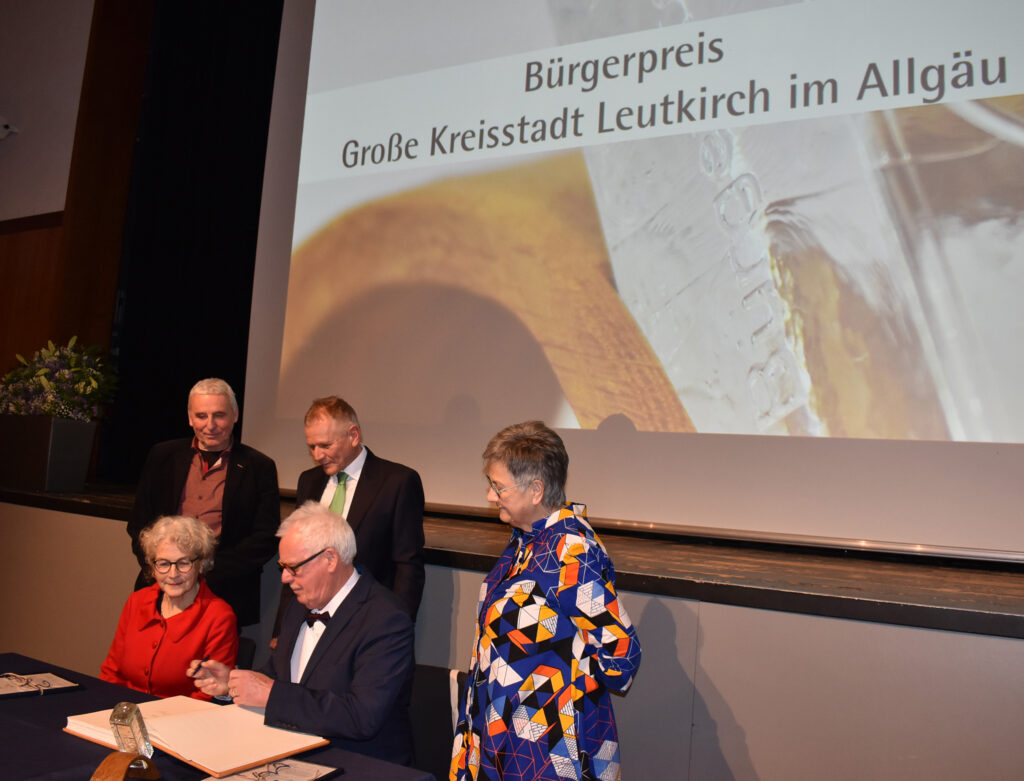 Ruth Groseker und Anton Mang bekamen sehr lange Beifall, das Publikum bestätigte die gute Wahl der beiden Bürgerpreisträger. Beide durften sich ins Goldene Buch der Stadt eintragen und bekamen den stattlichen Glaspokal aus der Glashütte Schmidsfelden.