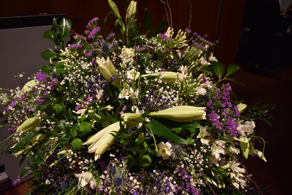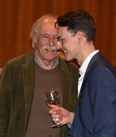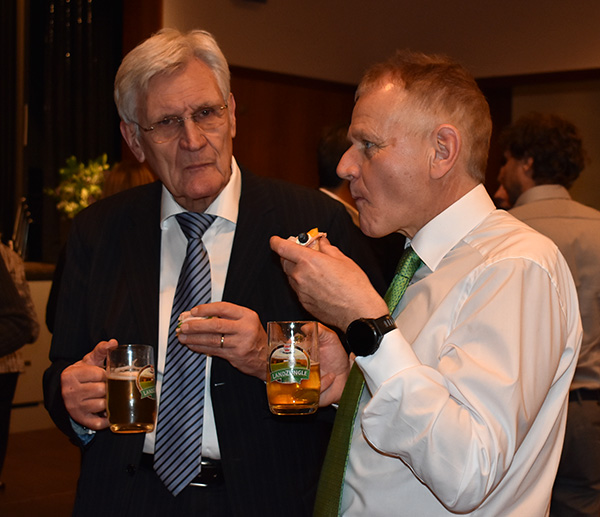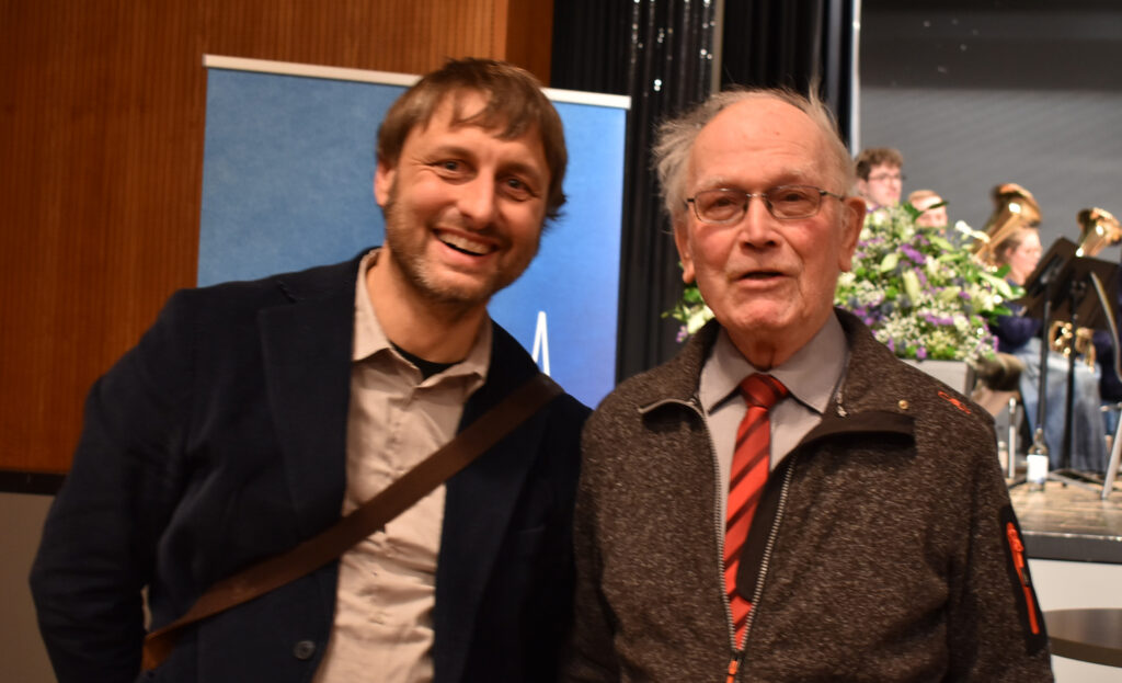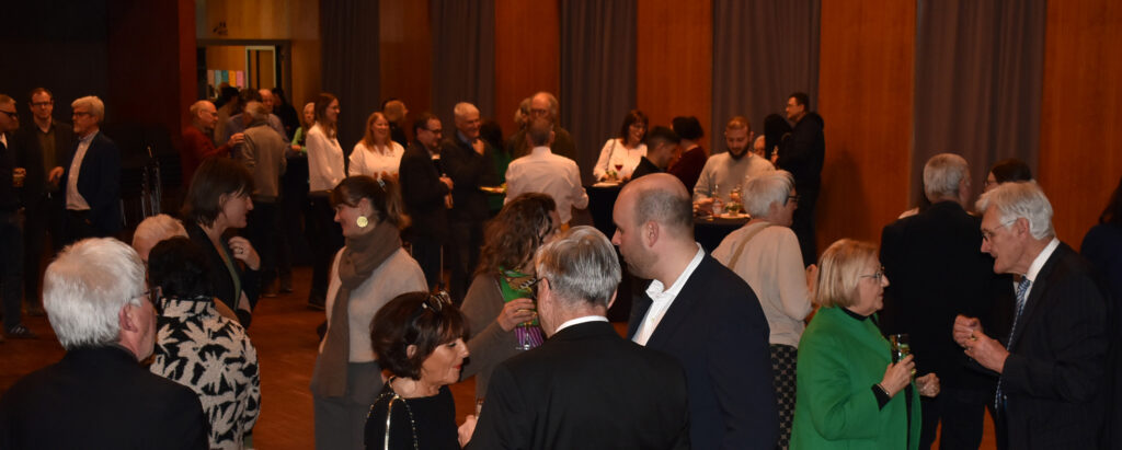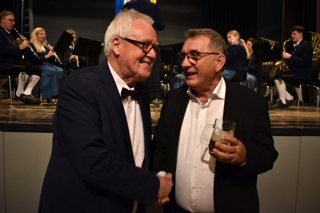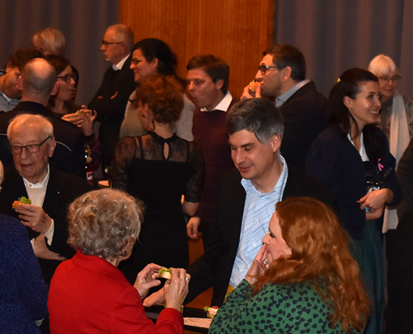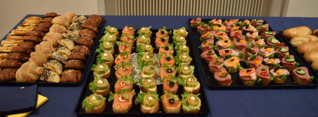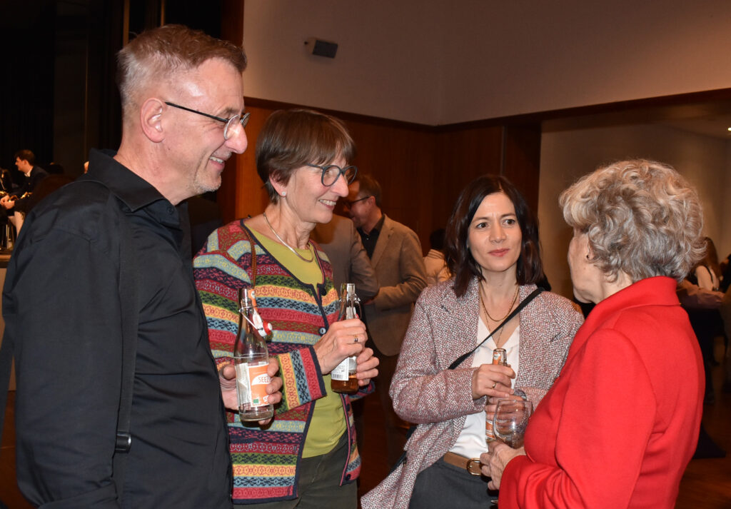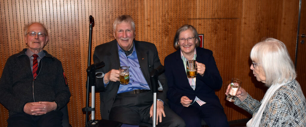 Nach dem Programm wurden schnell die Stühle weggeräumt, die Häppchen serviert, und die anwesenden Gäste fanden sich schnell zu Gruppen und anregenden Gesprächen zusammen. Viele Gratulationen gab es für Ruth Groseker und Anton Mang. Die Stadtkapelle spielte in kleinerer Besetzung und unterhielt mit flotten Weisen.