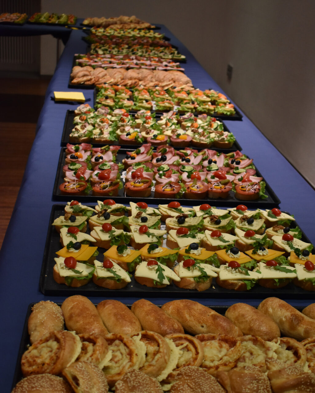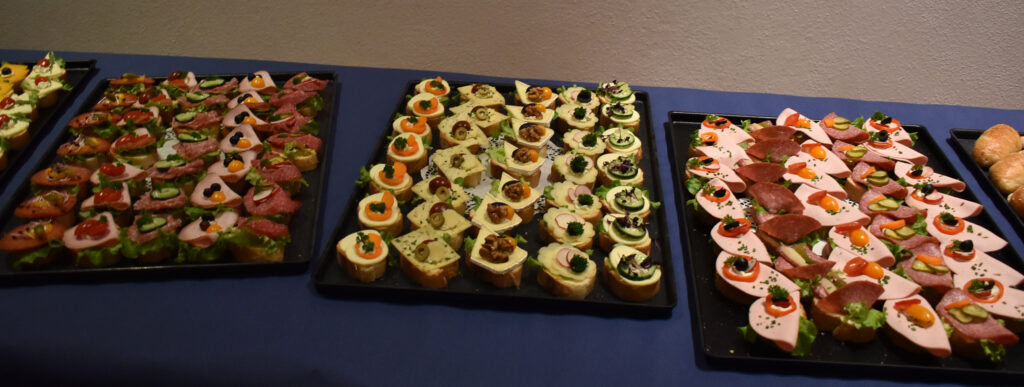 Der Neujahrsempfang der Stadt Leutkirch war von den städtischen Mitarbeitern wunderbar vorbereitet worden; das Team um Jacqueline Zenker sorgte rundum für das Wohl der Gäste, für Garderobe und Ausschank. Alles war frei, Bier, beste Weine, Säfte und leckere Häppchen, die die Bäckerei Steinhauser auf vielen Blechen geliefert hat. Der OB selbst band sich die Schürze um und reichte das Fingerfood.