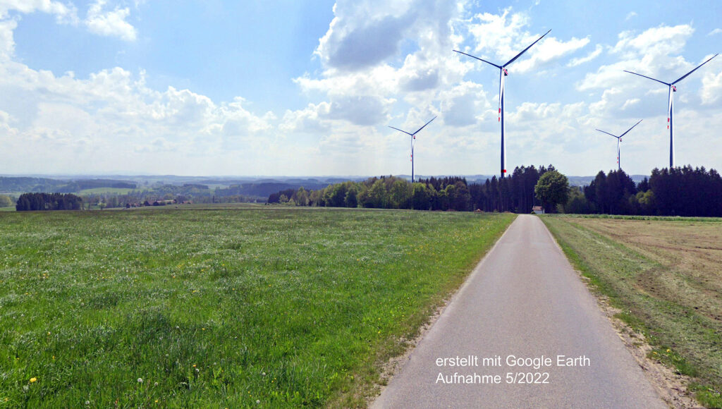Diepoldshofen (rei) – Reinhold Mall, Vorstand des gemeinnützigen Vereins Landschaftsschützer Oberschwaben-Allgäu e. V., hat Visualisierungen zu den Windkraftplanungen bei Diepoldshofen angefertigt. Mall ist dabei, wie vom Projektierer RES beantragt, von einer Höhe über alles von 300 Metern ausgegangen. Bis zur Bürgerversammlung am 26. Juni war man von 4 WKA im Diepoldshofer Wald ausgegangen, einem 38 Hektar großen Gebiet, das vom Regionalverband als Vorranggebiet für Windkraft ausgewiesen wurde (im Entwurf des Regionalplans). Derzeit sind von RES zwei WKA beantragt. Mall hat aufgrund der alten und noch nicht ad acta gelegten 4er-Planung 4 WKA in die Bilder einmontiert: Die Bilder hat er dem Dienst Street View entnommen und mit Hilfe von Google Earth erstellt. Obige Visualisierung wurde für einen Standort am Ortsende von Bauhofen gemacht, die nachstehende auf der Höhe bei Bodenhaus.
