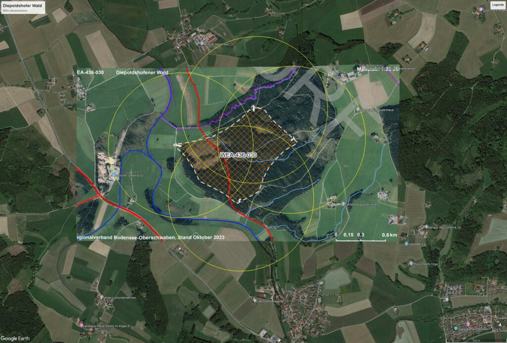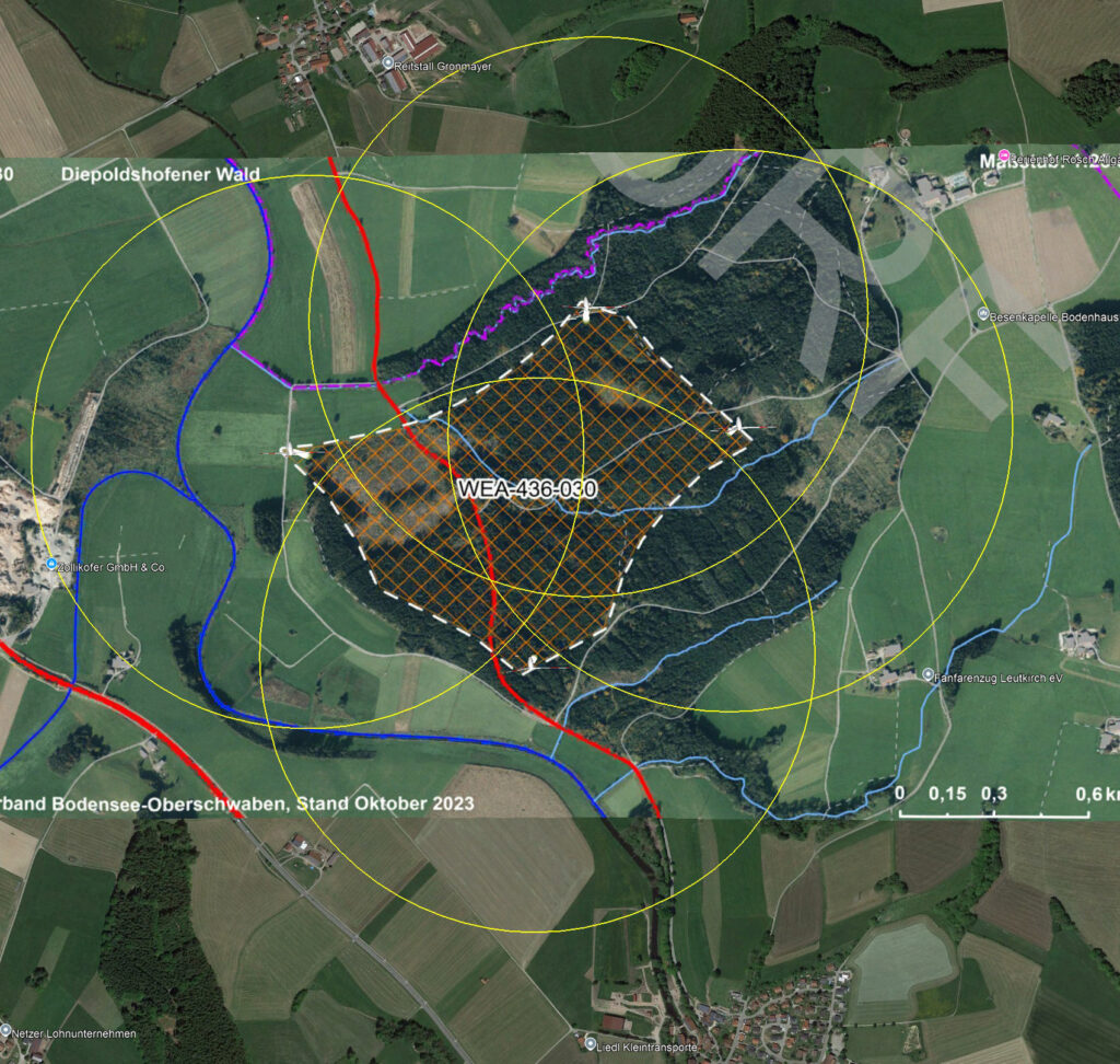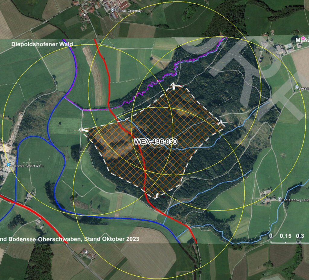 Links unten Rimmeldingen, links oben Reitstall Gronmayer, rechts oben Bergferienhof Rösch, rechts im unteren Viertel Bergkönig („Fanfarenzug“). Die gelben Kreise beschreiben 600 Meter Abstand zu vermuteten WKA-Standorten im Diepoldshofer Wald.