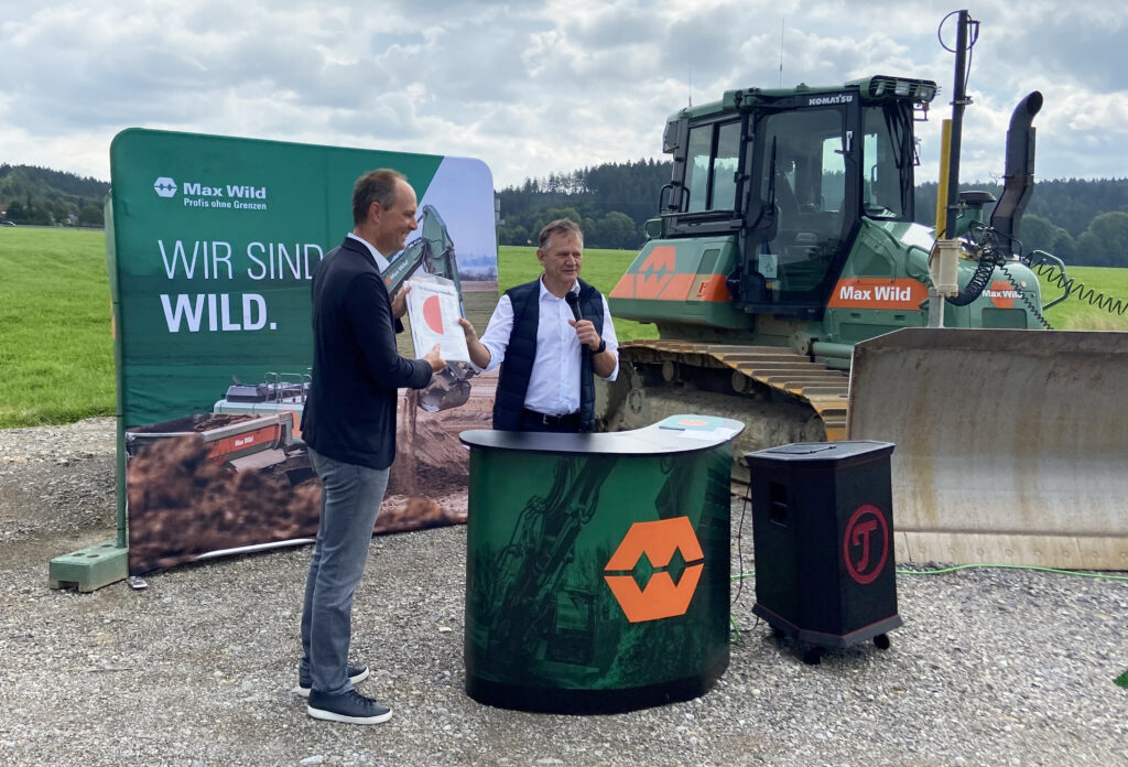 „Wir sind Wild“. So der Schriftzug auf einer tragbaren Informationsfläche beim Spatenstich am Freitagmorgen im Gewerbegebiet Bahnhof Friesenhofen. Wild entschlossen und tatendurstig, wild auf Wachstum. So der erste Eindruck an diesem Platz. Entsteht hier also ab jetzt ein Gewerbegebäude aus Stein, Glas und Stahl? Weit gefehlt! „Max Wild“, 1955 in Berkheim begonnen und seit sechs Jahren in Urlau aktiv, zeigt sich mit seinem ab jetzt entstehenden Firmenstandort Friesenhofen ganz in Holz. 360 Kubikmeter davon erarbeitet die Firma Sohm Holzbautechnik GmbH aus dem vorarlbergischen Alberschwende. Sohm-Geschäftsführer Christian Milz kündigte dabei eine „Holz-Wohlfühl-Atmosphäre“ in den neuen Räumlichkeiten an. Sie mit Holz zu erstellen, bedeute Klimaschutz. Es seien nämlich 292 Tonnen Kohlenstoffdioxid (CO2) in den Balken und Wänden gespeichert. Mit einer CO2-freien Energieversorgung aus Sonnenstrom und Wärmepumpe setze Max Wild hier „ein Wahrzeichen“.