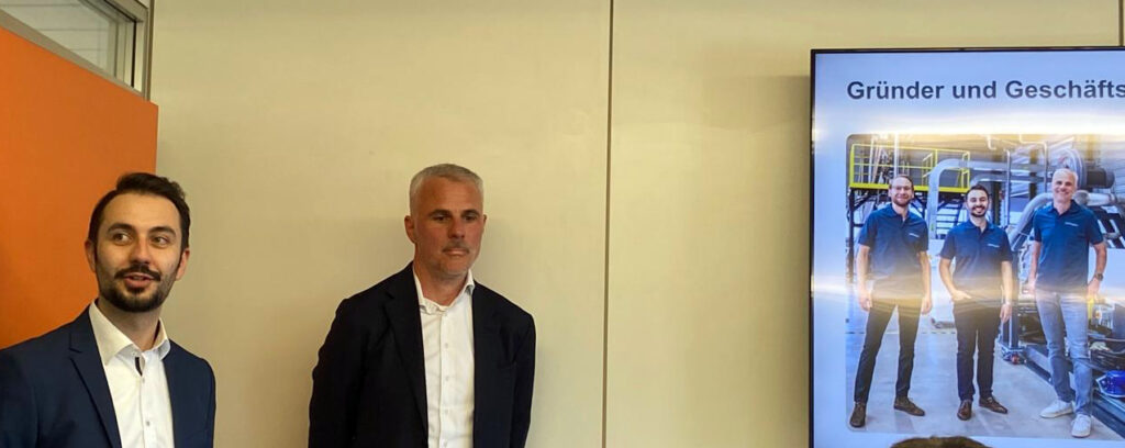 Die Geschäftsführer Michael Mayer (links) und Marco Seitner in natura und – rechts – auf dem Bild; dort ergänzt um den Technischen Direktor Tilo Hildebrand.