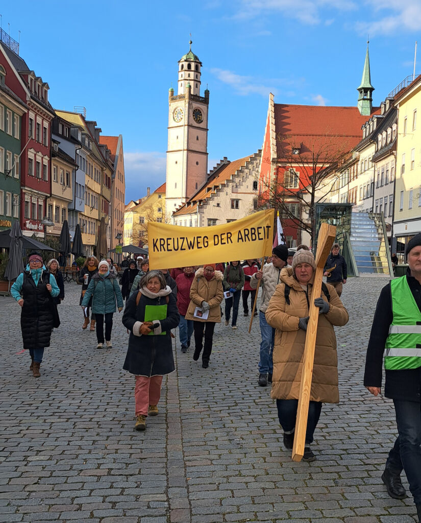 Ravensburg – Rund 50 Teilnehmerinnen und Teilnehmer nahmen am Kreuzweg der Arbeit in Ravensburg teil. Aktuelle Fragestellungen aus der Arbeitswelt und gesellschaftliche Auseinandersetzungen wurden an den einzelnen Stationen des Kreuzwegs in Verbindung mit dem Leidensweg von Jesus gebracht.