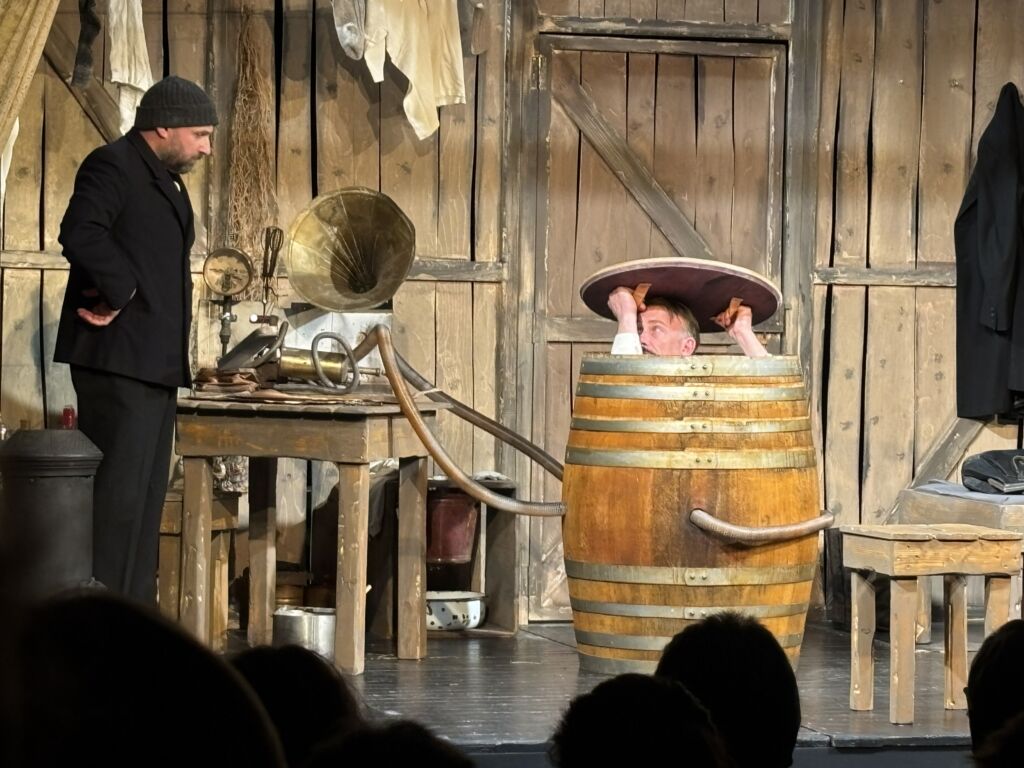 Smith und Wesson denken, diskutieren und kommen zu dem Schluss: Rachel muss in ein Weinfass steigen. Das schützt sie vor dem Aufprall, fasst acht Kubikmeter Luft und schwimmt im Wasser. Rachel: „Ich habe keine Angst vor dem Sprung. Ich habe keine Angst vor dem Sterben. Ich habe Angst, im Fass zu sein. Aber ich werde springen, um zu leben“. Smith: „Ich befestige eine Spieluhr im Fass. Die spielt drei Minuten. So viel Luft haben Sie.“ Rachel: „Ich setze mich in das Fass.“ Das Publikum lacht – und das Theaterstück nimmt Fahrt auf.