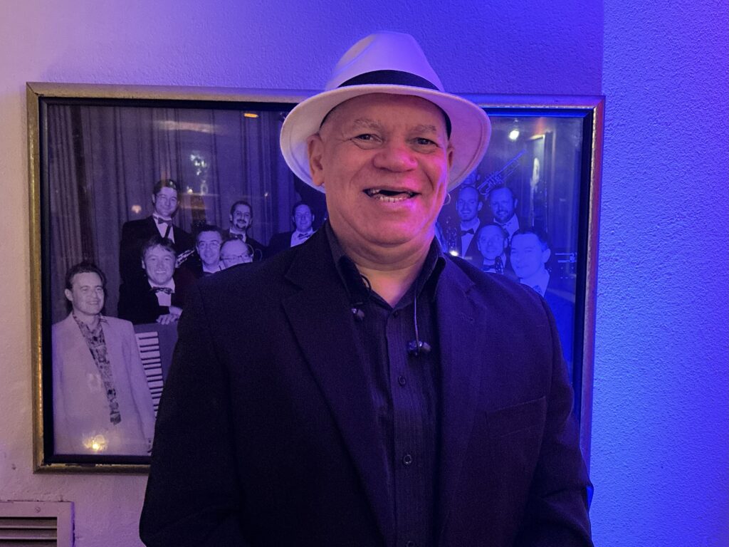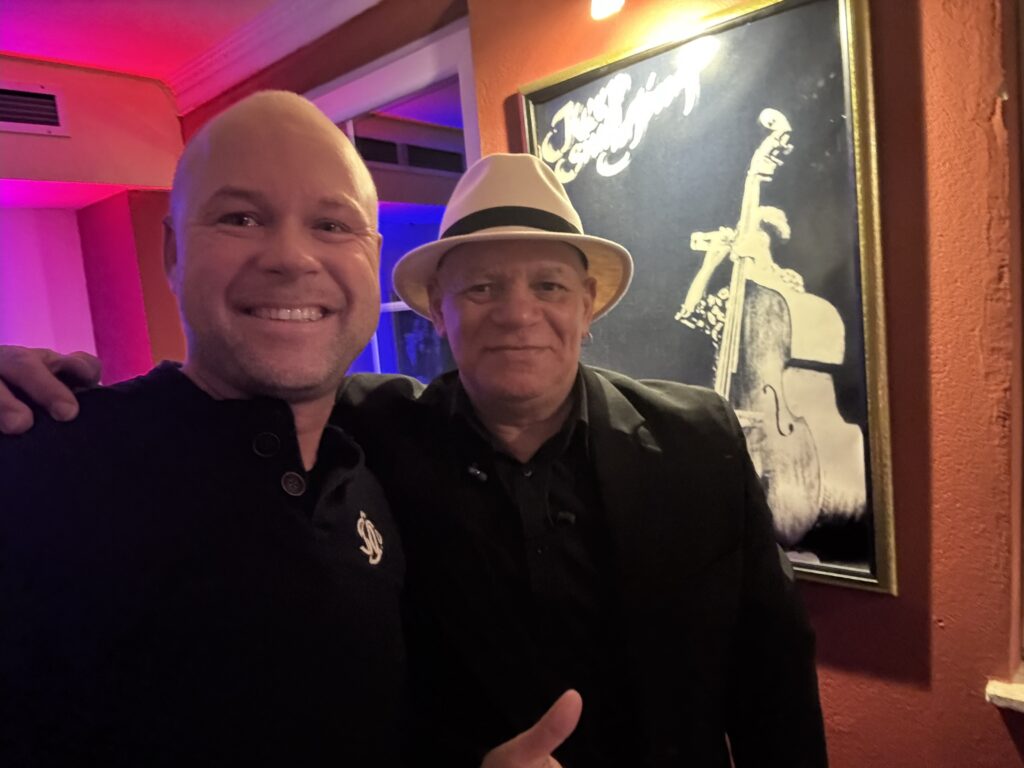 Alfonso Napoles als Leadsänger von „Gustavo“ strahlt auch ohne Musik viel Lebensenergie aus … und seine gute Laune hat sich – wie man sieht – auch auf unseren Autor Fred Nemitz übertragen. Foto: Jazzpoint