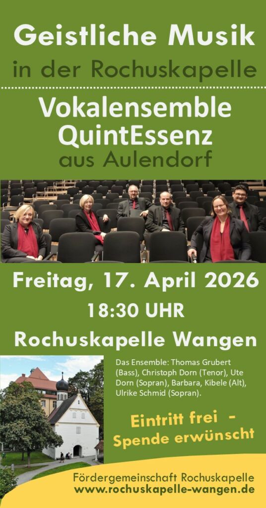 Wangen – Das Aulendorfer Vokalensemble QuintEssenz wird am Freitag, 17. April, um 18.30 Uhr in der Rochuskapelle Wangen ein Konzert geben. Gesungene geistliche Musik aus verschiedenen Epochen wird dabei erklingen. Außerdem wird ein kurzer Impuls zu hören sein, bei dem ein ausgesuchtes Bild der in Süddeutschland einmaligen biblischen Bilderdecke der Kapelle erschlossen wird.