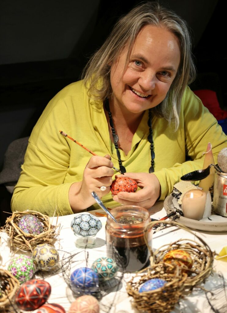 Mit den Jahren habe sie ihren Stil immer wieder verändert, sagt die 48-Jährige. „Früher habe ich viel gegenständlicher gemalt.“ Dann kam eine Zeit, in der sie sich an der Form des Eis orientiert hat. Das bedeutet, jedes Ei wurde in Felder vom Spitz zum unteren Ende eingeteilt und dann bemalt. Irgendwann war ihr das nicht mehr genug. So suchte sie nach einer Möglichkeit, das Ei unabhängig von seiner Form auszufüllen. „Das war nicht so einfach, weil ich ja am Ende auf der ungleichen Fläche wieder ankommen musste. Da musste ich richtig kämpfen, bis es geklappt hat“, erzählt sie. Nach in zwischen mehrjähriger „Übung“ klappt das fast wie blind.