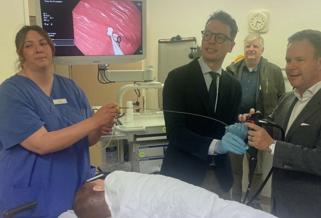 Wie benutzerfreundlich eine moderne Endoskopie funktioniert, durfte der Vorstandsvorsitzende der KSK, Dr. Patrick Kuchelmeister, an einer Trainingspuppe ausprobieren. Angeleitet von Prof. Martin Müller entfernte er einen an den Bildschirmen erkannten Fremdkörper mit einer zusätzlich eingeführten Schlinge aus dem virtuellen Magen-Darm-Trakt.
