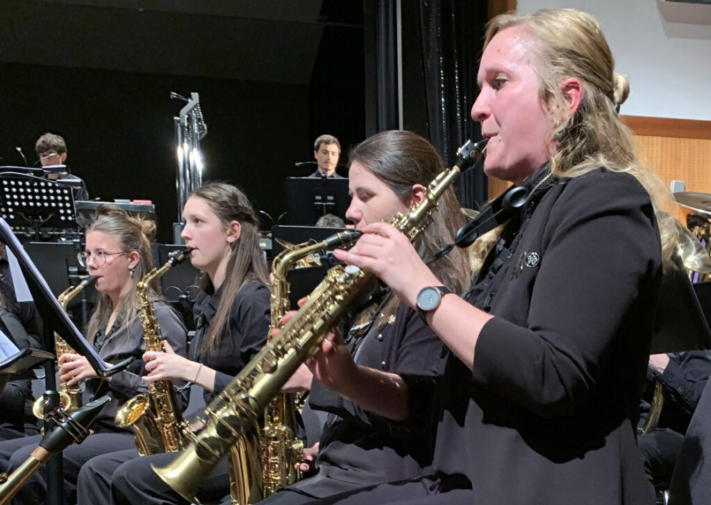 Thomas Wolf (Bild) war in seiner Ausbildung zum Dirigenten unter anderem Student von Thomas Doss, dem Komponisten der „Romanian Overture“. Er habe daher eine respektvolle Beziehung zu diesem Werk, die auch in der Einstudierung mit dem SBLA deutlich wurde. In diesem Werk wird der reichhaltige Volksliederschatz Rumäniens gewürdigt. Mit solchen Titeln möchte Wolf insbesondere Spaß am Musizieren vermitteln, was sich doch schließlich sehr gelohnt hat, möchte man als Zuhörer gerne bestätigen. Das Werk bestehe aus einem schwungvollen Intro, zwei Klageliedern und einem ekstatischen Finale, erläuterte der Dirigent. Die perfekte Interpretation enthielt erneut herrliche Soli und Passagen, beispielsweise mit Gong, Oboen, Klarinetten, Sopransaxophon und hohem wie tiefem Blech. Die Rasanz des Finales wurde durch Aufstehen, Klatschen und Rufen des gesamten Ensembles eindrucksvoll verstärkt.