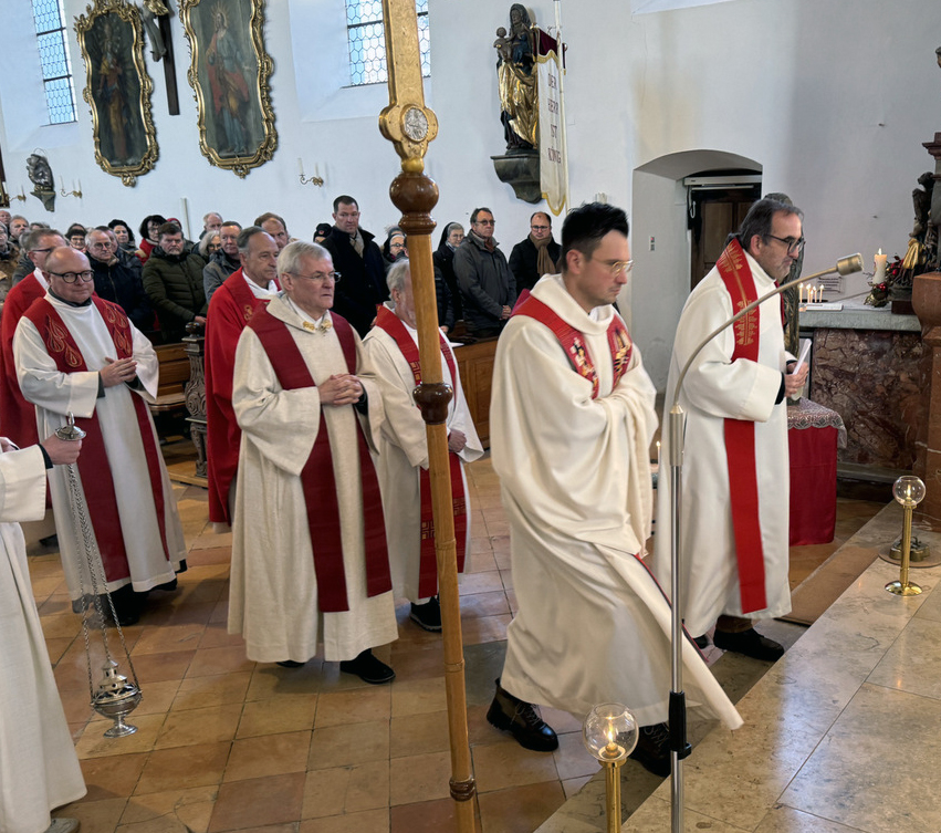 Die besondere Bedeutung dieses Gedenktags erkannte man auch daran, dass sich acht Priester und Diakone um den Altar versammelt hatten. Es waren dies von der Seelsorgeeinheit Bad Waldsee Pfarrer Thomas Bucher, Pfarrer Stefan Werner und Pater Hubert Vogel, von der Seelsorgeeinheit Bussen Pfarrer Alfred Tönnis, von der Seelsorgeeinheit Weißenau Pfarrer Fabian Ploneczk und Diakon-Ausbilder Erik Thouet, dazu Superior Ulrich Steck vom Kloster Reute, Superior Konrad Werder von den Salvatorianern Bad Wurzach; der 90-jährige Dekan i. R. Josef Mattes hatte Platz genommen im Altarraum. Hauptzelebrant war Pfarrer Thomas Bucher.