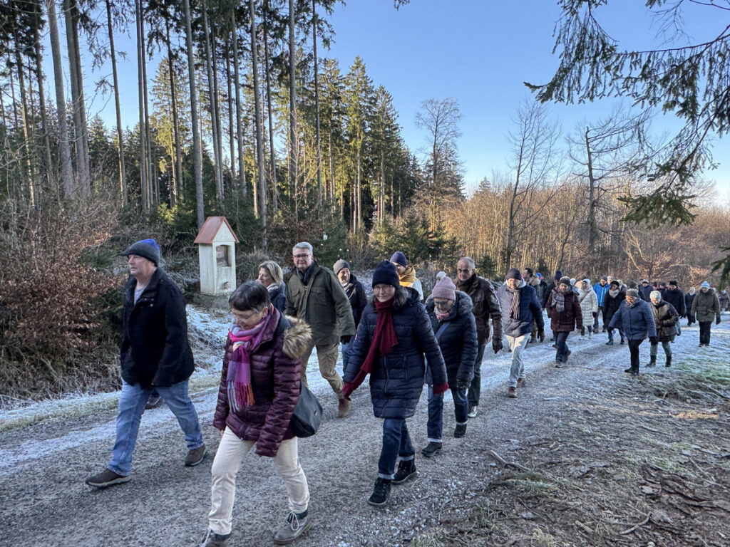 Als sich die große Pilgerschar nach der Festmesse betend und singend hinauf zur Sebastianskapelle auf den Weg machte, herrschte eitel Sonnenschein bei Temperaturen knapp unter 0 Grad.. Der stete Anstieg ist durchaus beschwerlich, aber auffallend viele ältere Menschen meisterten diese Herausforderung ganz gut, darunter auch der 94-jährige Hermann Kemmler. „Die Wallfahrt ist für mich Pflicht“, meinte der treue Mitpilgernde. Die Wegstrecke war mit Kies rechtzeitig bestreut worden, da sich der Schneebelag im Waldbereich doch teilweise in Eis verwandelt hatte. Oben erstrahlte die Kapelle im hellem Sonnenlicht unter blauem Himmel, umgeben vom prachtvollen winterlichen Fichtenwald.