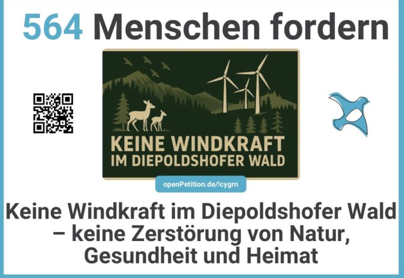 Diepoldshofen (rei) – Die am 17. Mai gestartete Online-Petition, die sich gegen die Errichtung von Windkraftanlagen im Diepoldshofer Wald richtet, hat – Stand 26. November, 18.00 Uhr – 564 Unterstützer-Unterschriften. Dies entnahmen wir der Webseite openpetition.de/!cygrn . 279 der Unterschreibenden sind laut der Petitionswebseite Einwohner Leutkirchs (Kernstadt oder Gesamtgemeinde – wird nicht eindeutig dargestellt); 52 Proteststimmen kommen aus Diepoldshofen und 54 aus Reichenhofen; 14 kom…