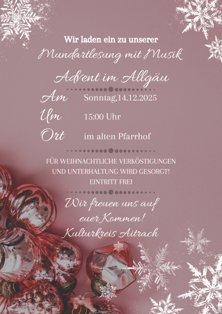 Aitrach – Der Kulturkreis Aitrach veranstaltet am Sonntag, 14. Dezember, um 15.00 Uhr Im Alten Pfarrhof in Aitrach eine Mundartlesung mit musikalischer Umrahmung zum Thema “ Advent im Allgäu“.