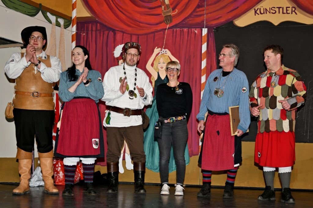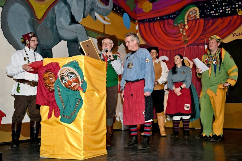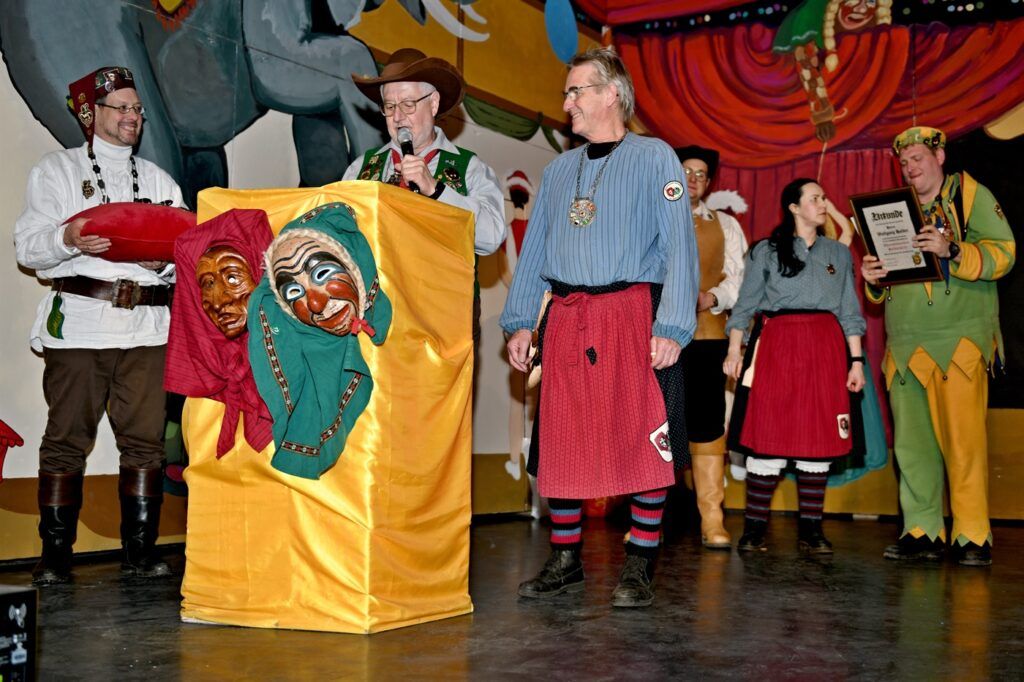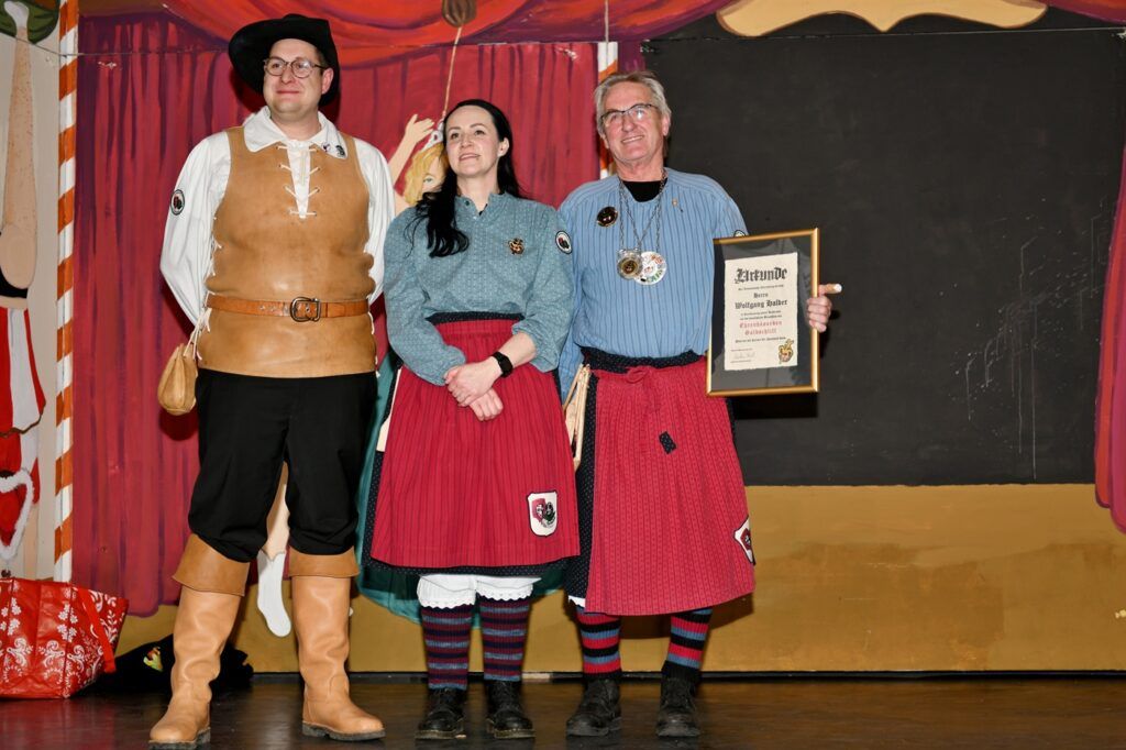 Zwischendurch gab es verdiente Ehrungen durch die Vertreter des Alemannischen Narrenrings für langjährige Mitglieder. So der Ehrenzunftmeister Wolfgang Halder, der mit dem Goldschliff-Orden des Alemannischen Narrenrings ausgezeichnet wurde; in seiner Laudatio hob Jürgen Fiedler noch einmal die Verdienste von Wolfgang Halder hervor.