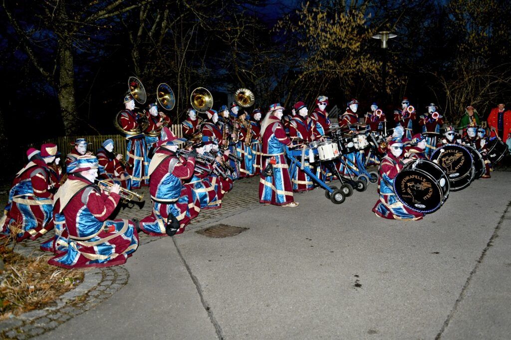 Die heimische Lumpenkapelle blies und trommelte zum Angriff und zur Machtübernahme, danach zog ein langer Fackelzug zur Festhalle in die “Piratenhalle“, getreu dem Motto der diesjährigen Aitracher Fasnet „Narrenwelt im Zirkuszelt“. Von der Aitracher Lumpenkapelle wurde den Besucher gleich richtig in der wunderschön dekorierten Festhalle eingeheizt.
