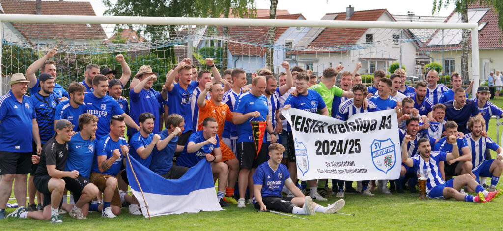 Aichstetten – Eine historische Saison geht mit dem Meistertitel der Kreisliga A3 und dem erstmaligen Aufstieg in die Bezirksliga für den SV Aichstetten zu Ende! Dass diese Saison 2024/25 mit der Meisterschaft endete, konnte keiner so wirklich ahnen, als sich im Sommer 2024 ein komplett neues Trainerteam um Cheftrainer Fabian Durach aufstellte. Durach kam vom SV Neuravensburg zum SV Aichstetten mit einer neuen Spielidee und zog diese in der jungen Aichstettener Mannschaft von Anfang an durch. Besseres Pass-Spiel mit eingespielten Spielzügen sollte für mehr Torgefahr sorgen und gleichzeitig mit einer disziplinierten Verteidigung den Gegnern das Toreschießen schwermachen.
