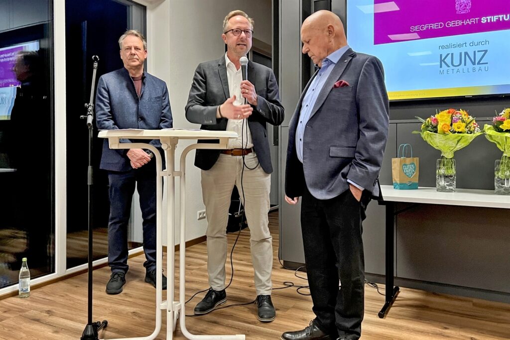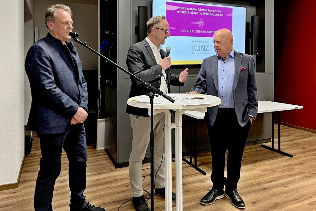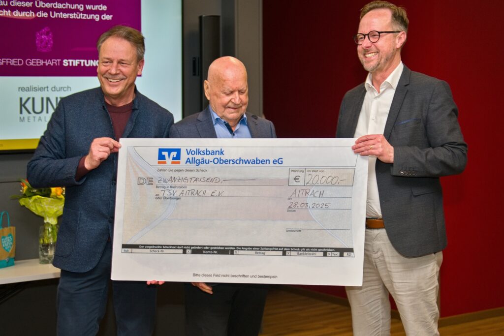 Insgesamt 70.000 € spendete die Siegfried-Gebhart-Stiftung dem TSV Aitrach. Am 28. März übergab der Senior-Chef von Gisoton einen Scheck über 20.000 € (nachdem es zuvor 50.000 € gegeben hatte). Den großherzigen Spender flankieren TSV-Vorstand Manfred Saitner (links) und Bürgermeister Kellenberger.