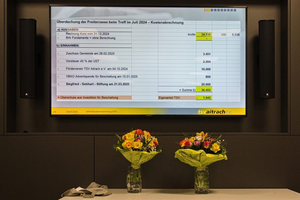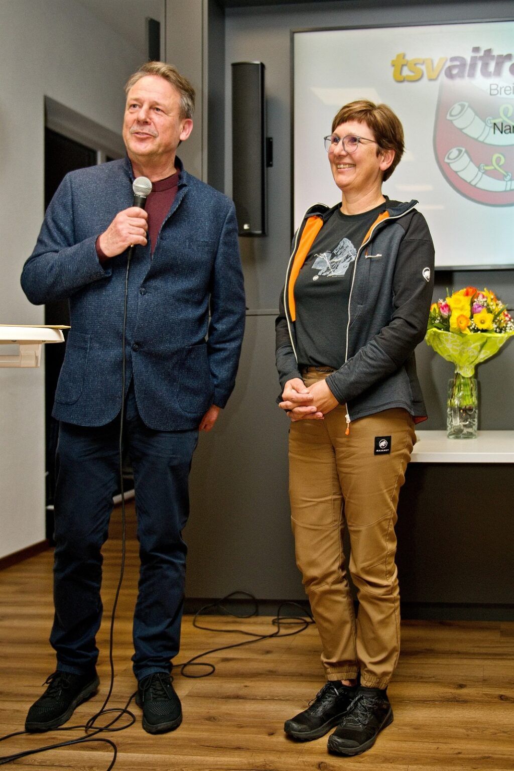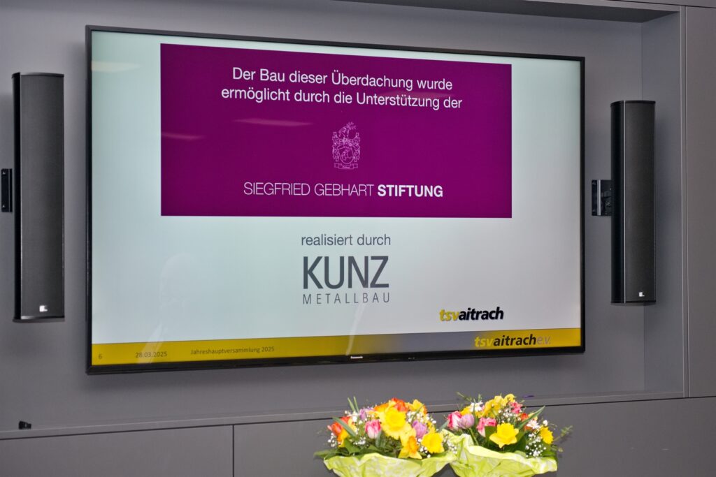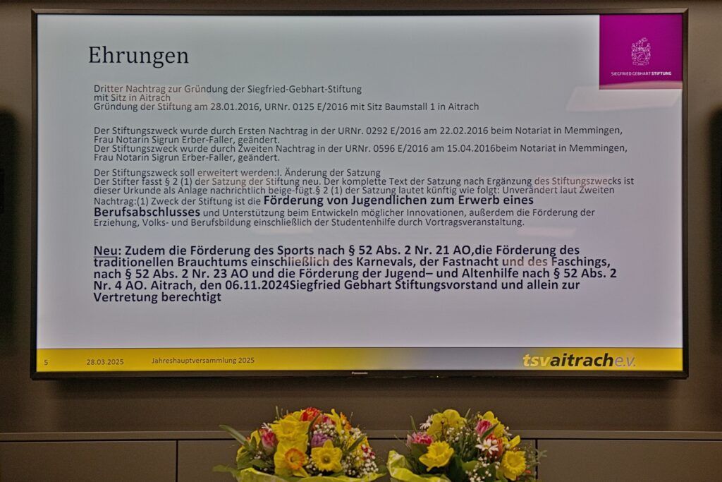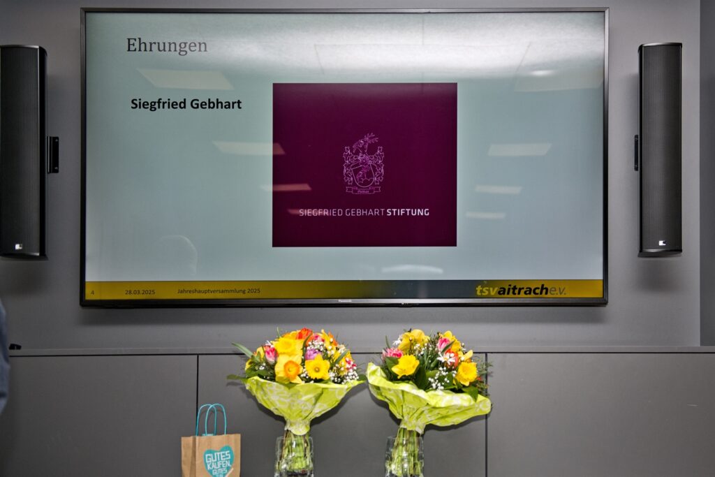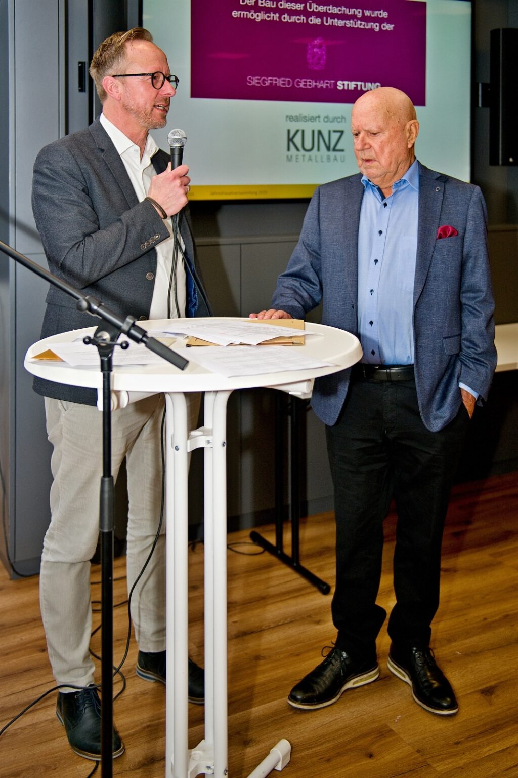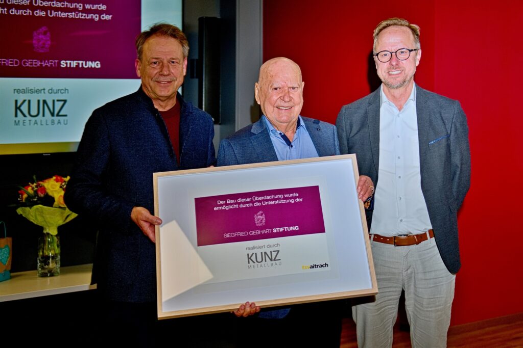 Als zweiter Tagesordnungspunkt stand eine besondere Ehrung an: Siegfried Gebhart, der mit seiner Stiftung den Verein im letzten Jahr großzügig finanziell unterstützte, bekannt als Unternehmer, nahezu 50 Jahre Chef und Mitbegründer der Firmengruppen KBH Hetzlinshofen, Gisoton Aichstetten und Lissmac Bad Wurzach. Er hat 2016 eine Stiftung mit seinem Namen ins Leben gerufen, deren Ziel es ist, benachteiligte Jugendliche zu unterstützen, damit sie ihren Platz in der Gesellschaft finden und eine Berufsausbildung absolvieren. Natürlich hat der Seniorchef auch ein Herz für die örtlichen Vereine. So auch für den TSV Aitrach, dessen Ehrenmitglied er seit 2022 ist. Nun kamen weitere 20.000 Euro an Zuschüssen von der Stiftung Siegfried Gebhart, die den TSV beim TREFF-Neubau zuvor schon mit großzügigen 50.000 Euro unterstützt hatte. Dafür wurde Siegfried Gebhart durch Bürgermeister Thomas Kellenberger und dem Vorsitzenden des TSV Manfred Saitner besonders geehrt.