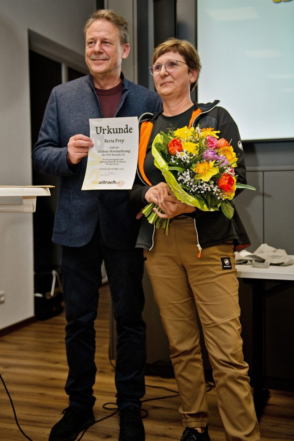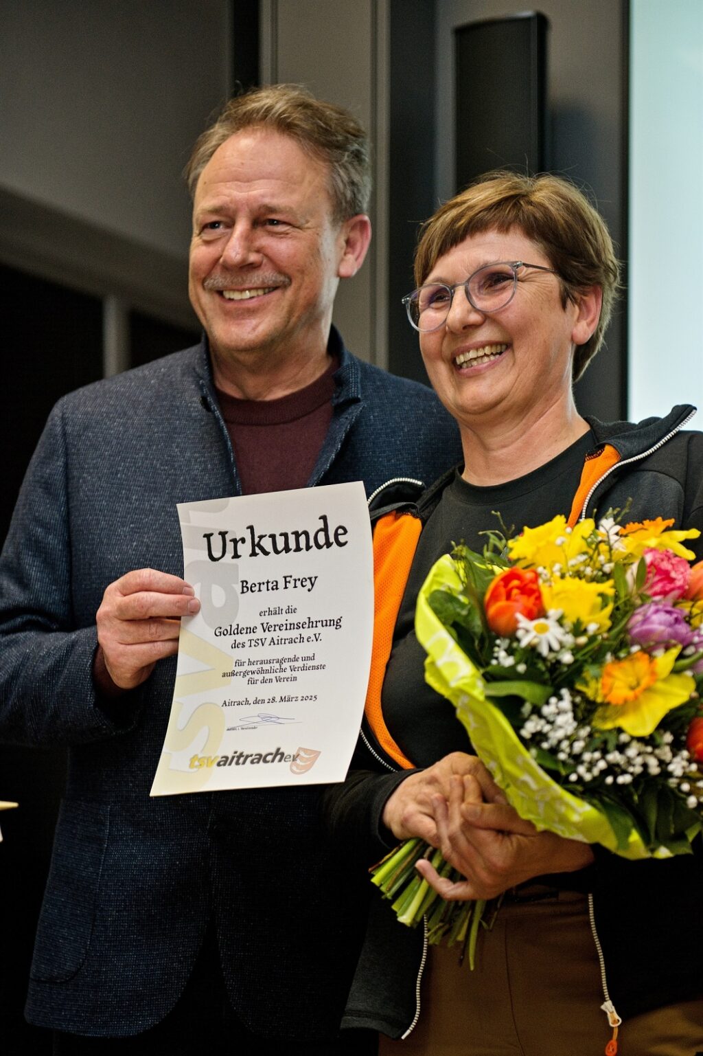 Eine Frau, die in nahezu allen Bereichen des TSV tätig war, erhielt vom Vorsitzenden Manfred Saitner die Goldene Vereinsehrung des TSV Aitrach für herausragende und außergewöhnliche Verdienste für den Verein: Berta Frey.