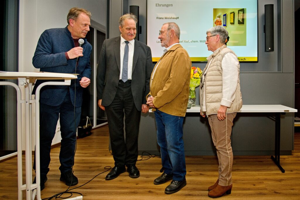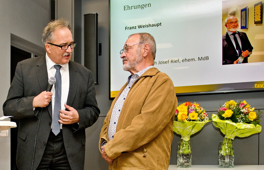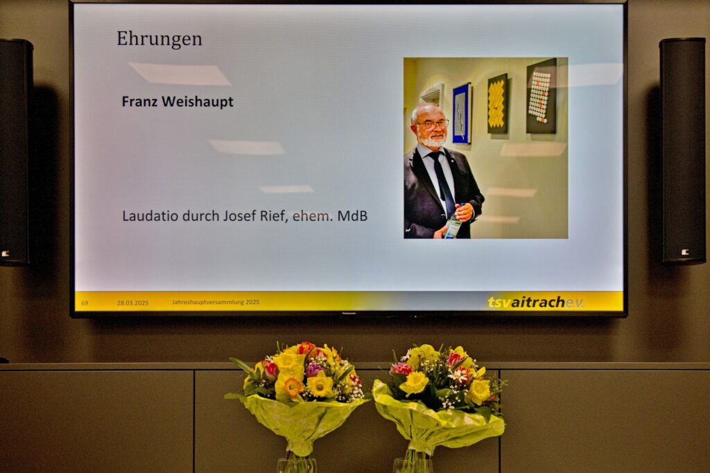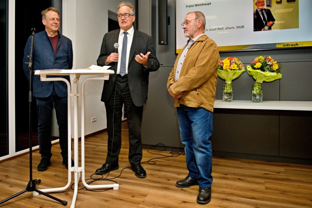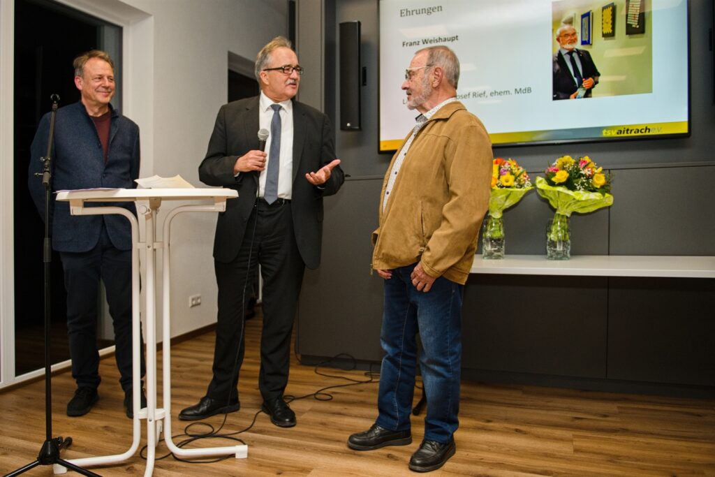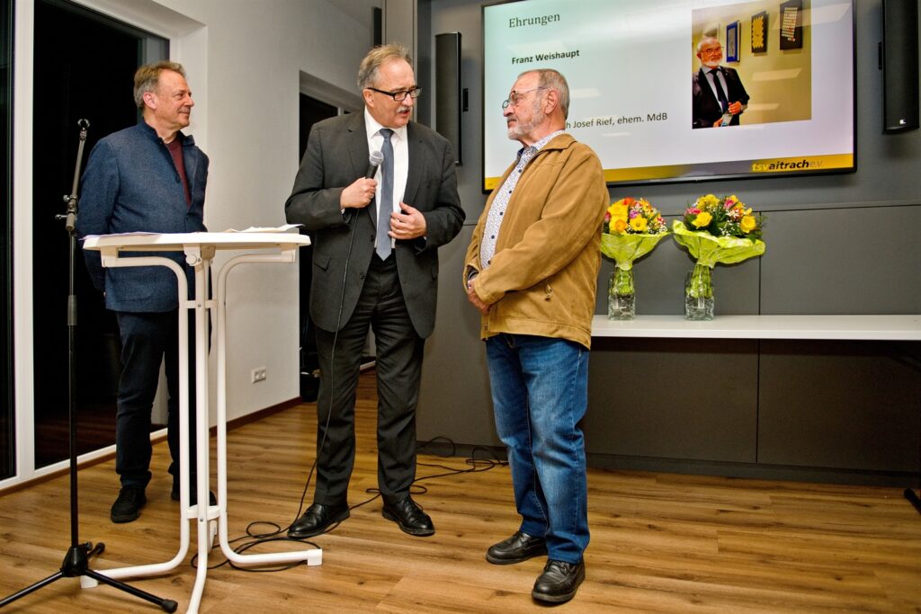Die Laudatio auf Franz Weishaupt hielt der langjährige Bundestagsabgeordnete Josef Rief: Franz Weishaupt, inzwischen 84 Jahre alt, ist fast sein ganzes Leben lang ein Macher und eine feste Größe des TSV Aitrach. Zwischen 1969 und 1980 leitete Franz Weißhaupt die Abteilung Leichtathletik im Verein und erzielte in verschiedene Disziplinen unzählige Titel auf Kreis-, Bezirks-, Landes und Bundesebene.