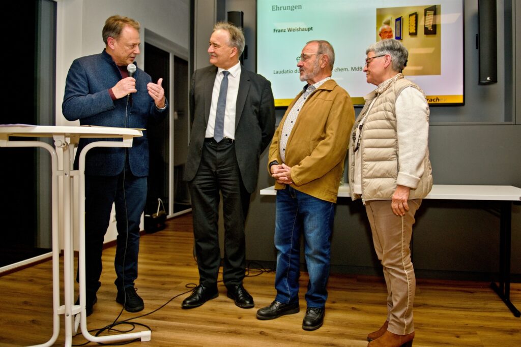 „Jede Ehrung kann nur ein kleines Dankeschön an solche Menschen sein“, sagte Rief. Sie kann aber nie ausreichende Anerkennung für ein solches Lebenswerk sein. Heute möchten wir den vielen Ehrungen eine weitere hinzufügen. Sie stammt nicht aus dem sportlichen oder Vereinsbereich, sondern ist eine Auszeichnung des Landes für verdiente Menschen, welche das Ehrenamt in vorbildlicher Weise abbilden und Vorbild für andere sein können. Diesen Vorbildern nachzueifern ist eine Ehre und Verpflichtung für Jung und alt. Josef Rief zeichnete Franz Weishaupt mit einer Medaille des Bundestages aus. Der Abgeordnete Rief hat ein kleines Kontingent an solchen Medaillen; die wohl letzte bekam Franz Rief.