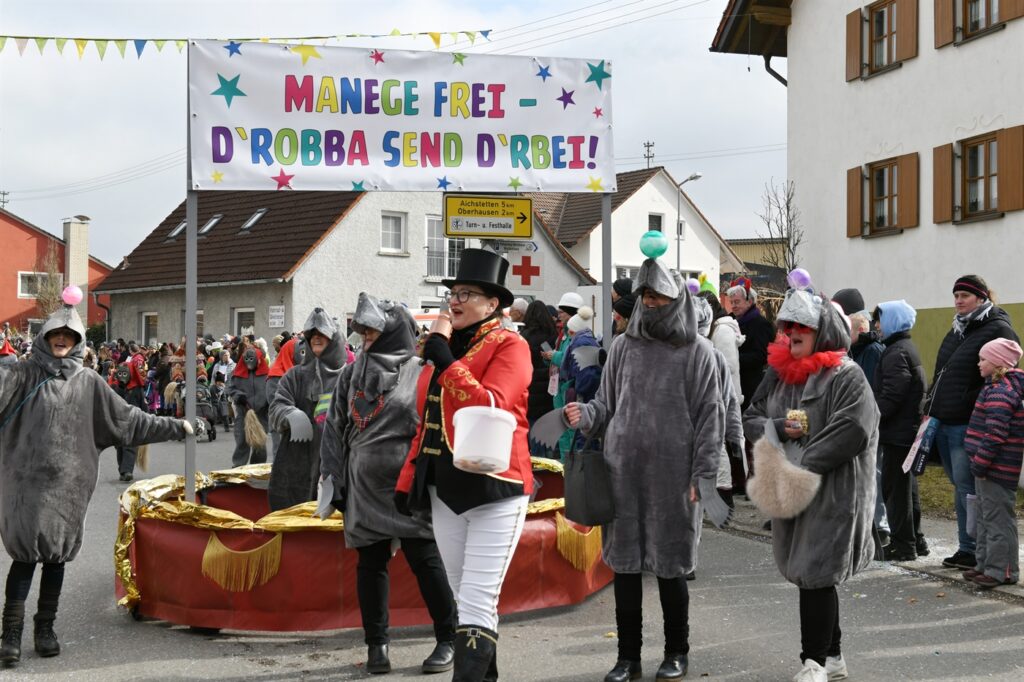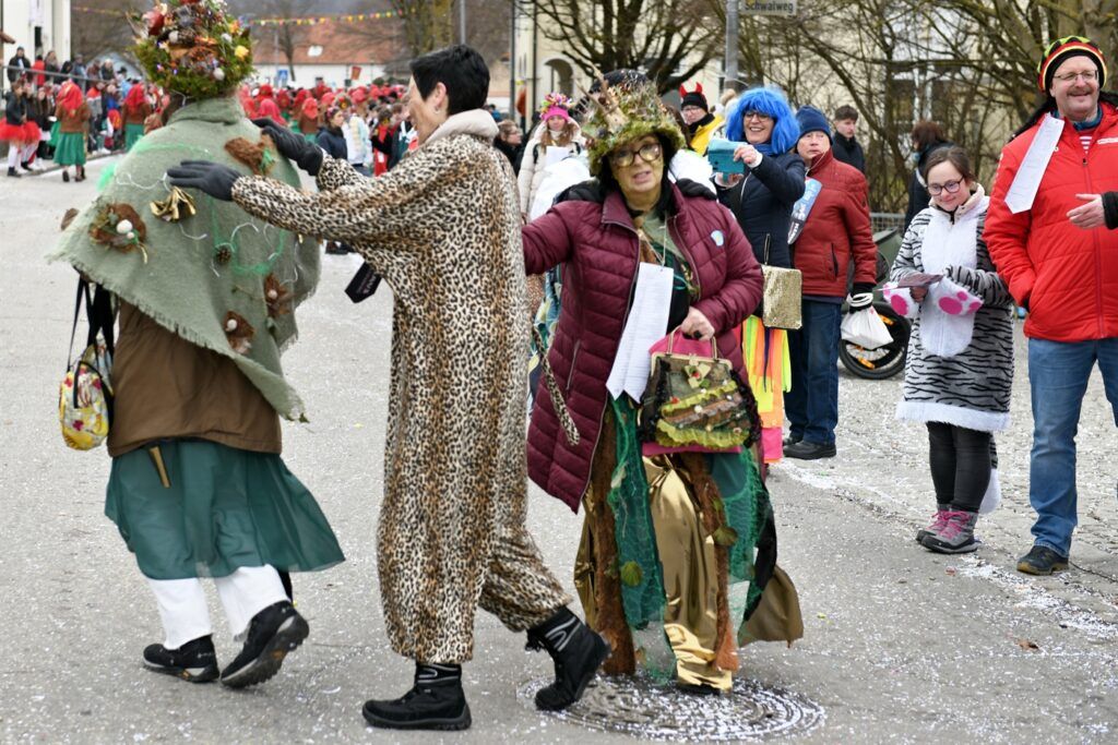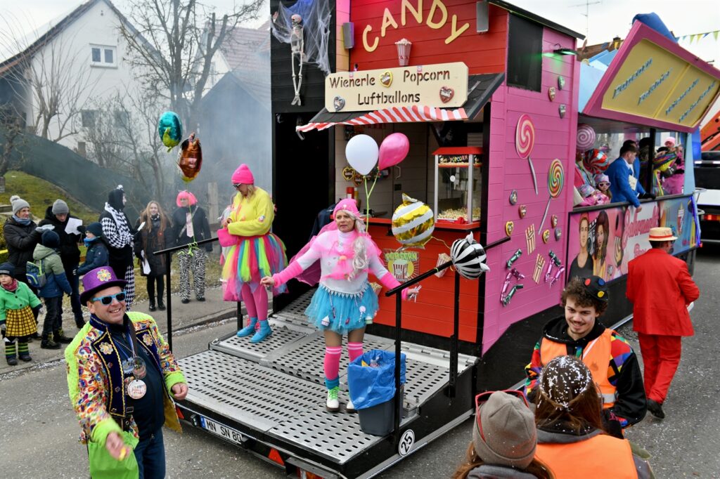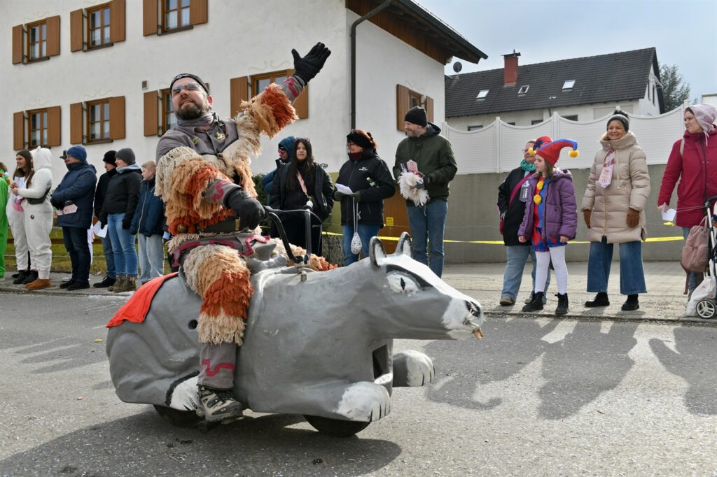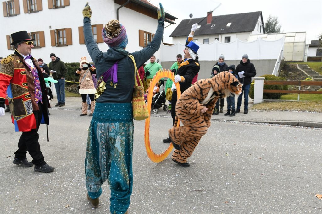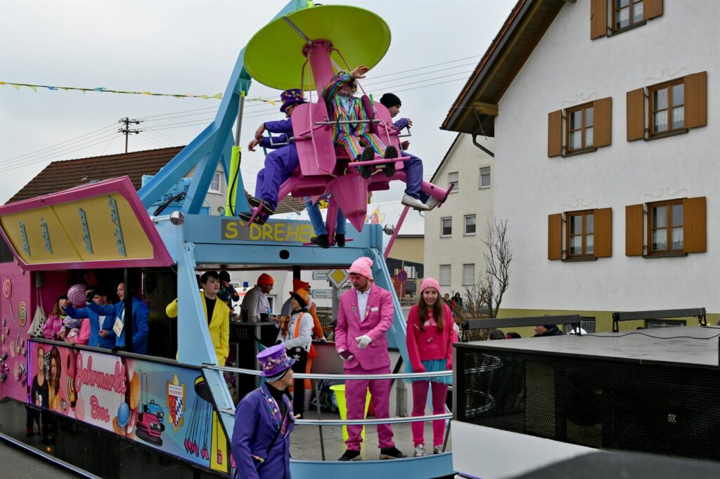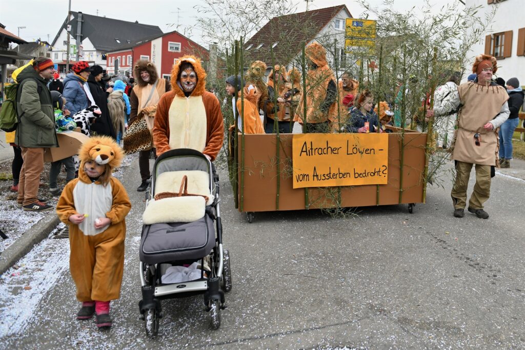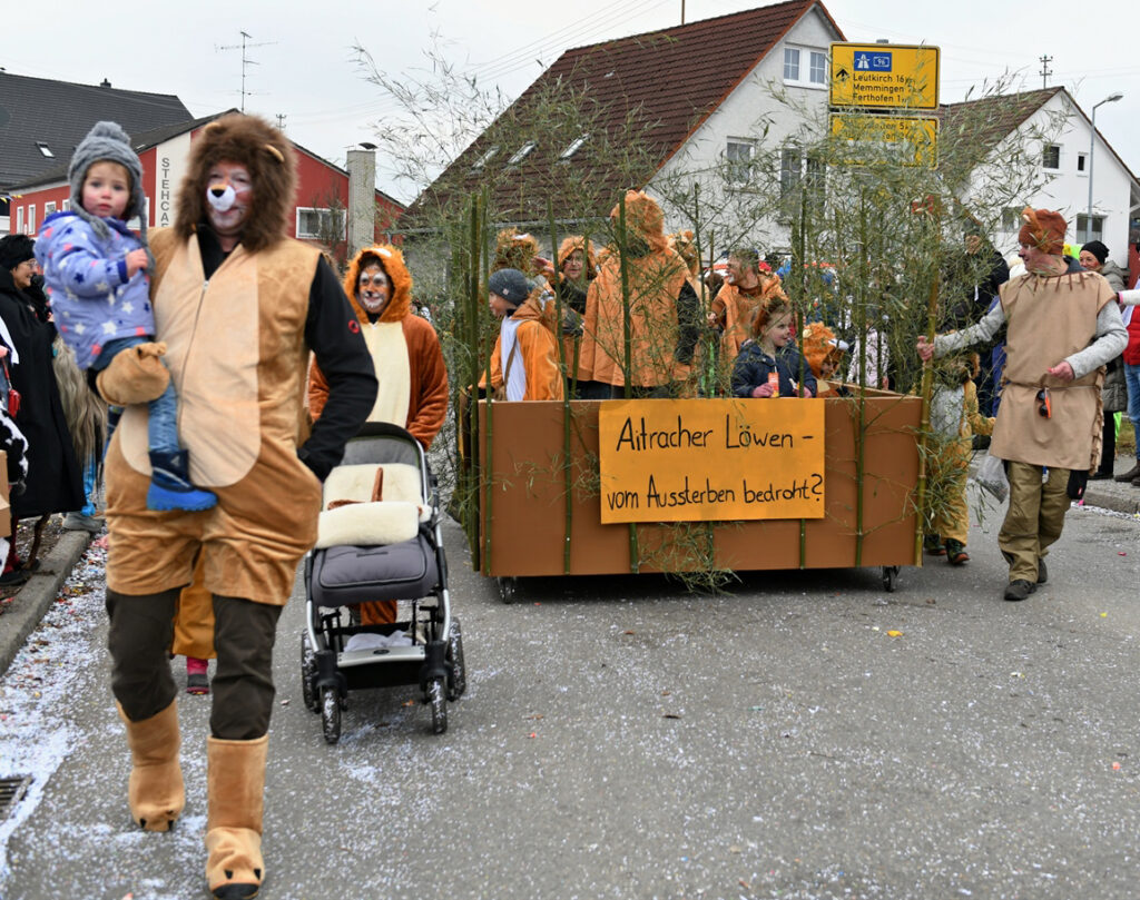 Höhepunkte und absolute Hingucker beim Aitracher Gaudiwurm waren die heimischen Fußgruppen und Wagenbauer, welche die Zirkuswelt, aber auch aktuelle politische Themen der Gegenwart in Stadt und Land bunt und fantasievoll präsentieren. Die Musikkapelle der Teilgemeinde Treherz führte den Zug an, gefolgt von den Aitracher Narrenzunftgruppen Roi- und Kellaweible, den Prinzenpaaren Florentine und Andreas und Laura und Jakob sowie den Gardemädchen.