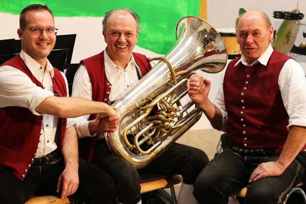 Weiter ging’s in alpenländischer Manier: Ein Blechquintett brachte den „Walzer für Irmi“ zu Gehör, in der Mitte die Tuba – stattlich und klangvoll. Danach folgte das Stück „Für Bastl“, natürlich stilecht in Tracht. Heimatklang pur.