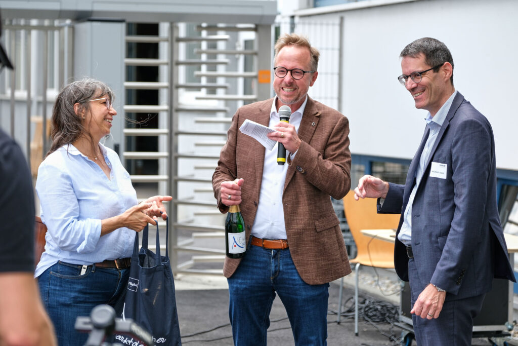Freut sich sehr über das starke Bekenntnis von Klaus Multiparking zum Standort Aitrach: Bürgermeister Kellenberger. Er und seine Mitarbeiterin Doris Maurer überreichen dem Klaus-Gesellschafter Michael Menzl aus der Schweiz den Aitracher Gemeinde-Sekt. Foto: Ingo Jensen/Klaus Multiparking