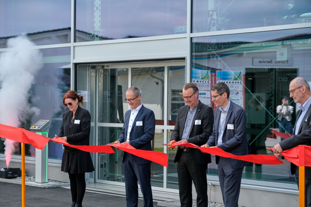 Gemeinsam durschnitten sie das rote Band und weihten damit das kVarium in Aitrach ein, von links: Ilona Wachter Gurski (Geschäftsführerin), Norbert Blessing (Technischer Leiter), Michael Groneberg (Geschäftsführer), Michael Menzl (Gesellschafter) und Helmut Knittel (Verwaltungsratsvorsitzender). Foto: Ingo Jensen/Klaus Multiparking