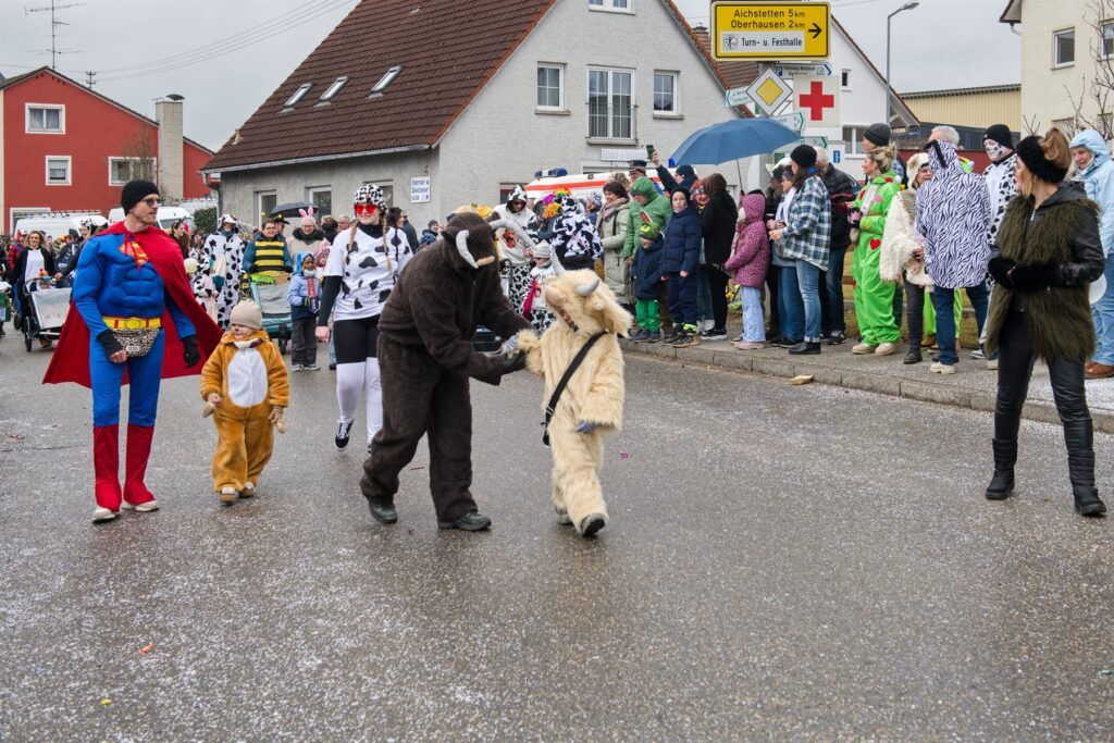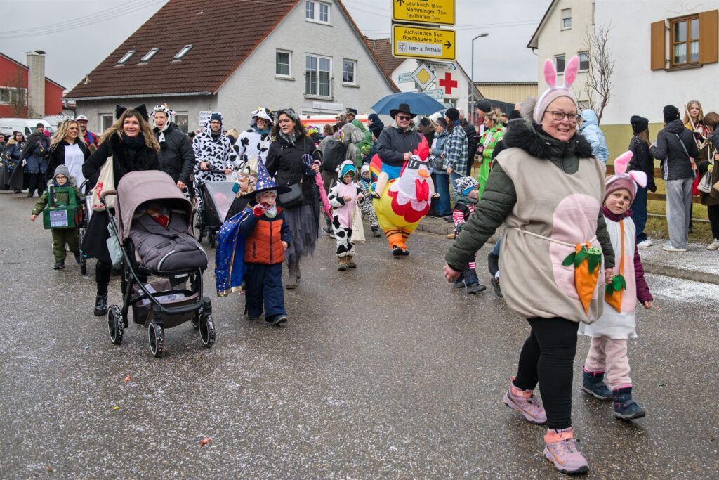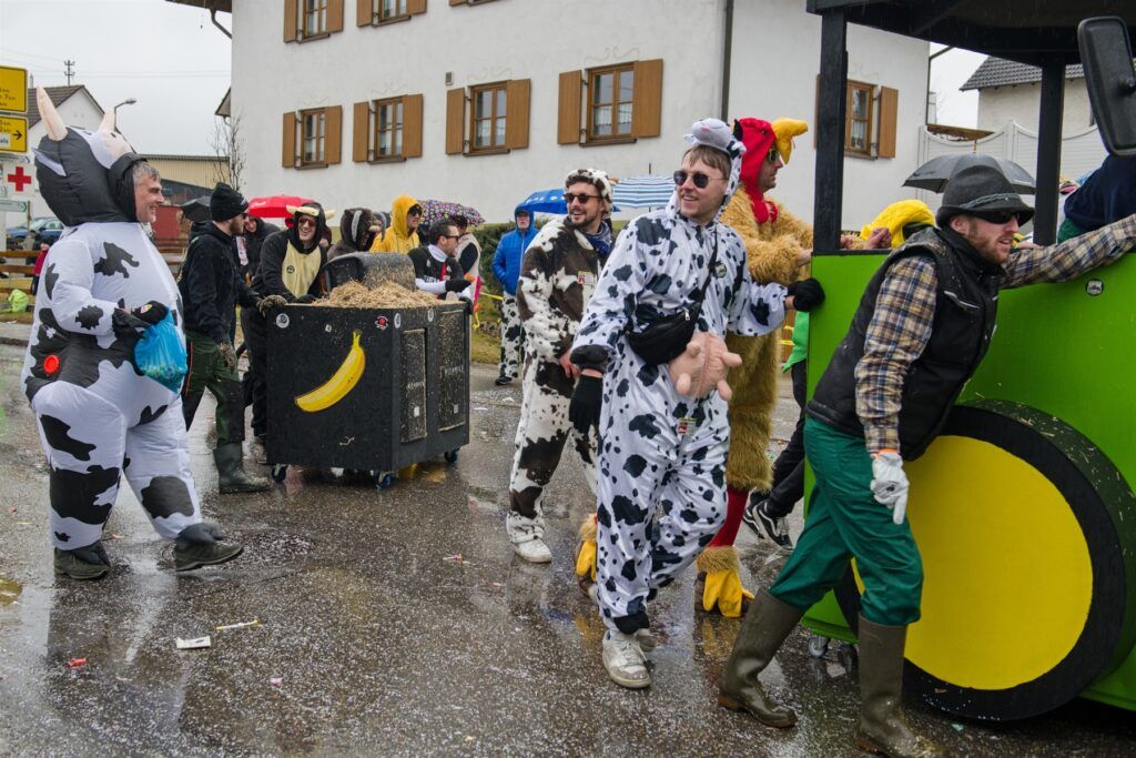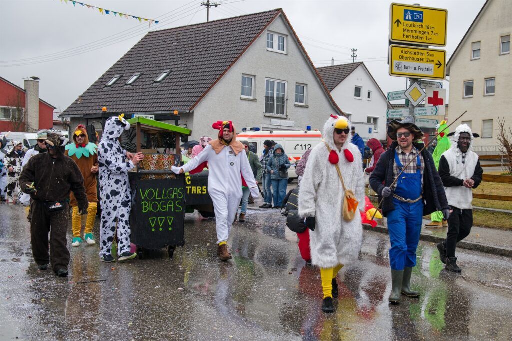 „Gruber und Freunde“ erinnerten auf dem Bauernhof, was macht Spaß: „Schaun das Schaf“. Die Bannwald Narren Vogelscheuchen, Stroh im Kopf, der „Royale Freundeskreis “Steck da Kopf it en da Sand – d`Straußa send omanand“. Der „Förderverein der glückseligen Fasnet“ bedauerte Löwen ade – Hirsch Juhee. Die Aitracher Fußballer als FC Allstars „Ackerbau und Viehzucht und Biogasanlage. MV Aitrach und Freunde – Aitracher Stallfliegen „Fluiga Dätschr“.